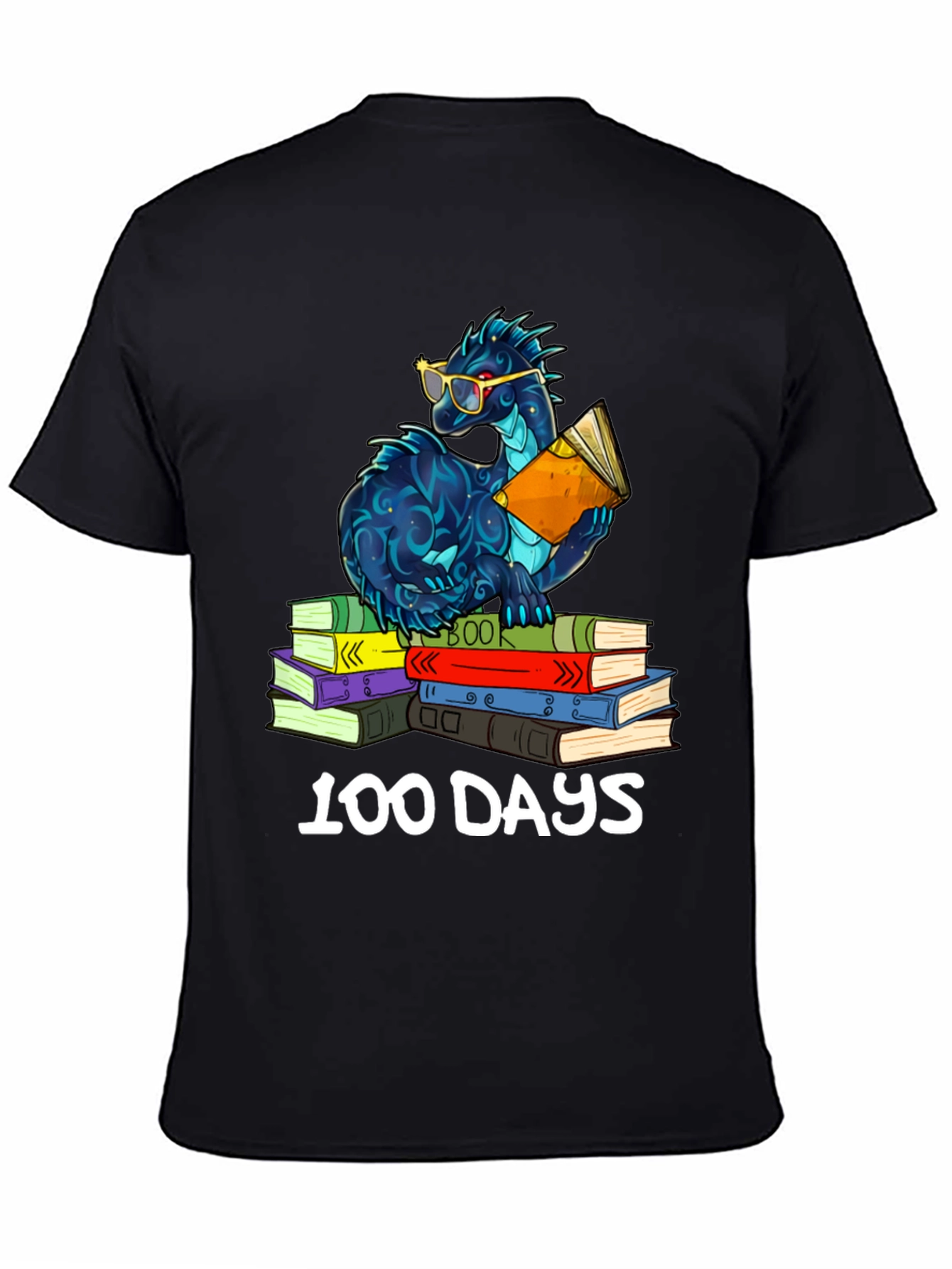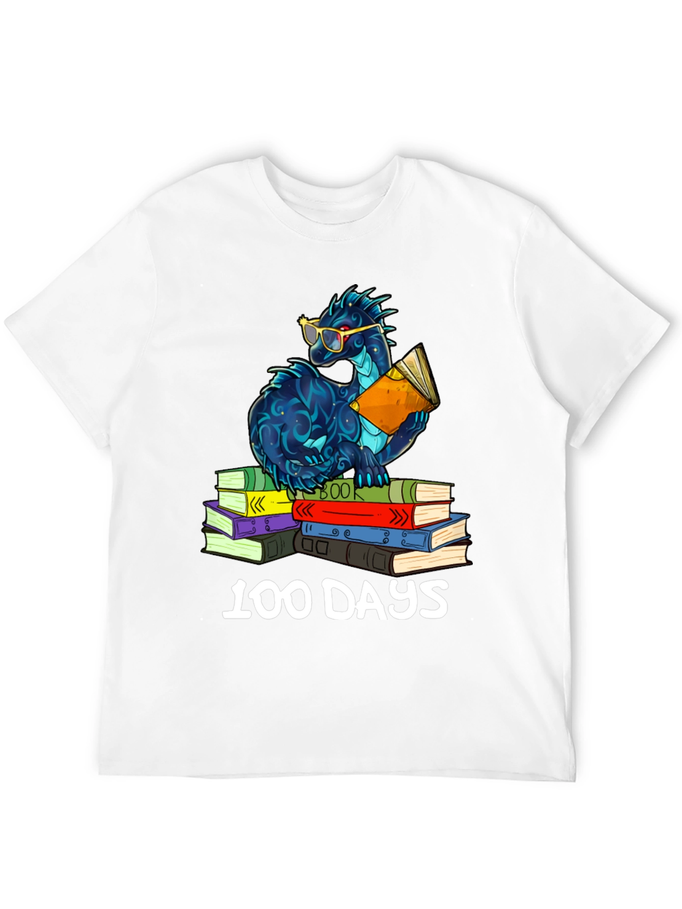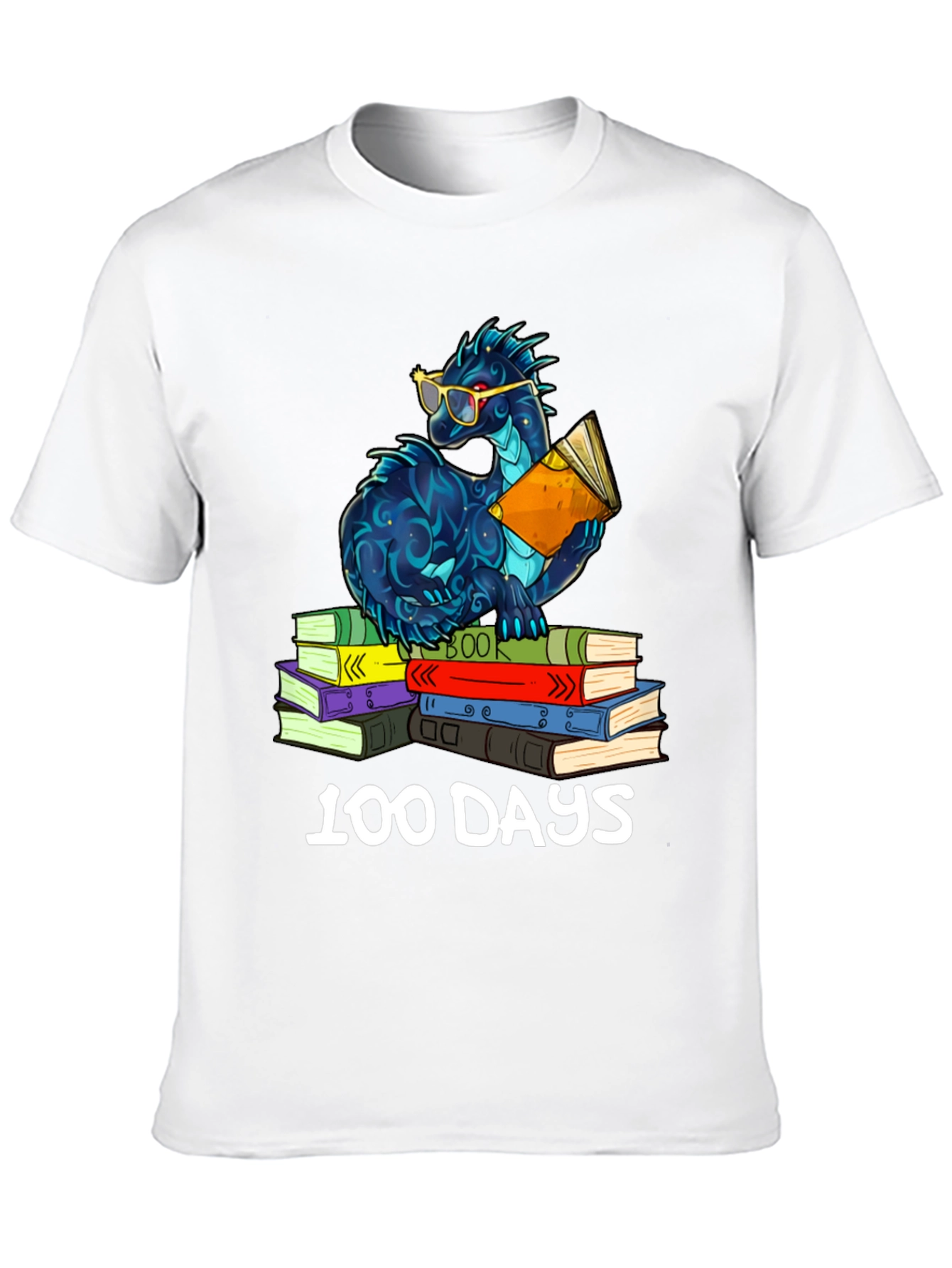 Celebrate 100 days of school with this fun and unique t-shirt! The design features a cool, blue dragon wearing glasses and reading a book while sitting atop a stack of colorful books. The words "100 DAYS" are prominently displayed below the stack, making it a perfect outfit for teachers and students to commemorate this special milestone in the school year. Made from a comfortable fabric, this tee combines education and fun.