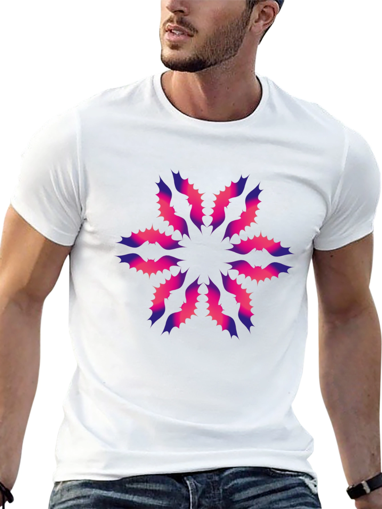 Elevate your casual style with this striking black t-shirt. Featuring a vibrant, abstract floral graphic, this tee is sure to turn heads. The design showcases a unique petal pattern with a gradient from bold pink to deep purple. Made from a comfortable, breathable fabric, this shirt is perfect for everyday wear. Pair it with jeans or shorts for a relaxed yet fashionable look. Express your individuality with this standout piece that effortlessly blends comfort and artistic flair.