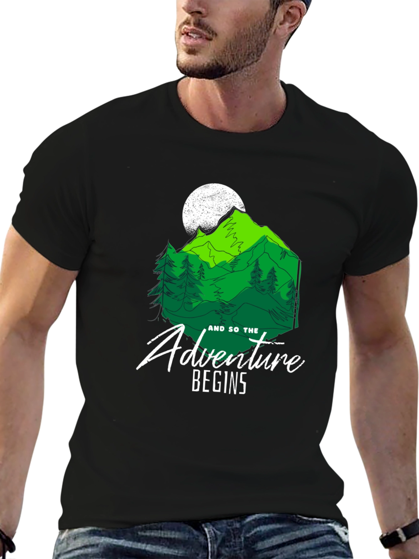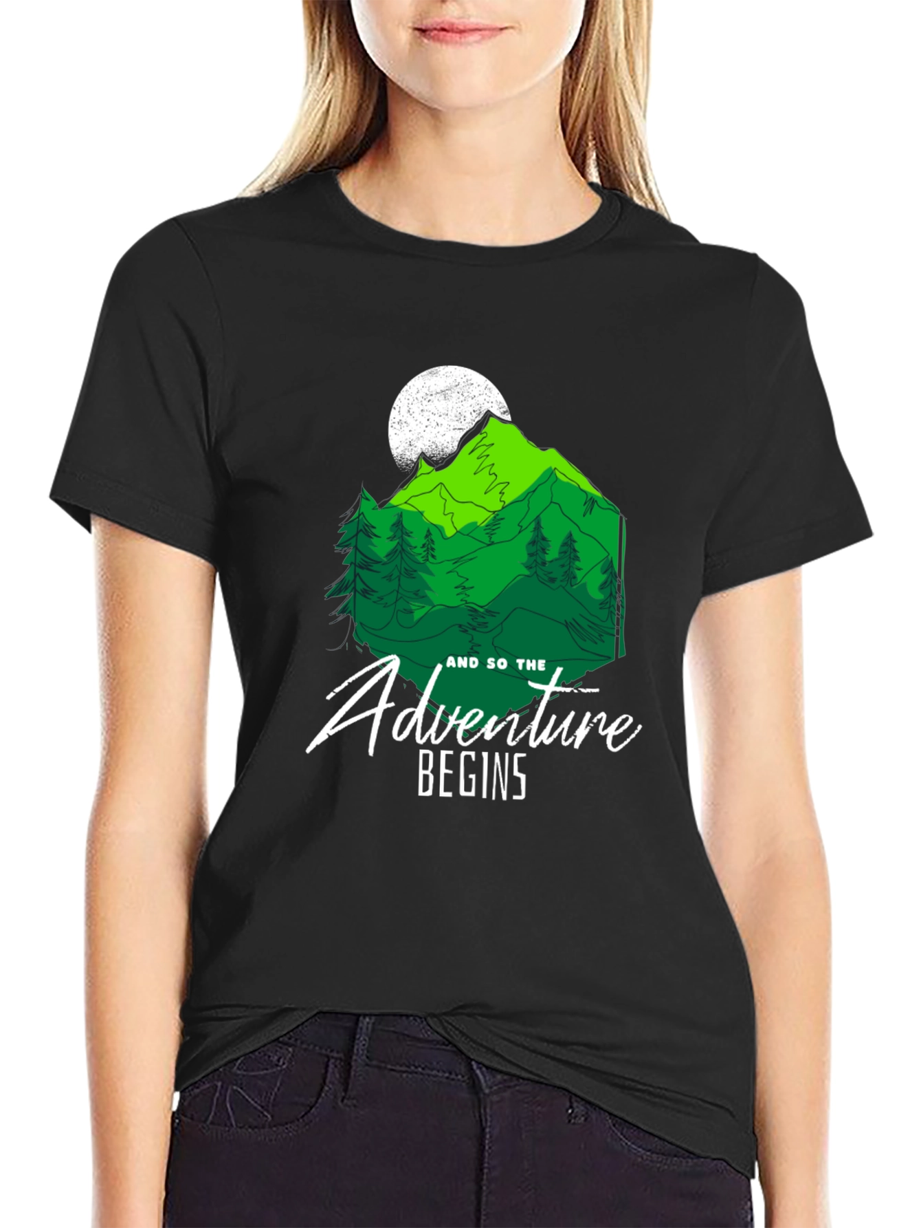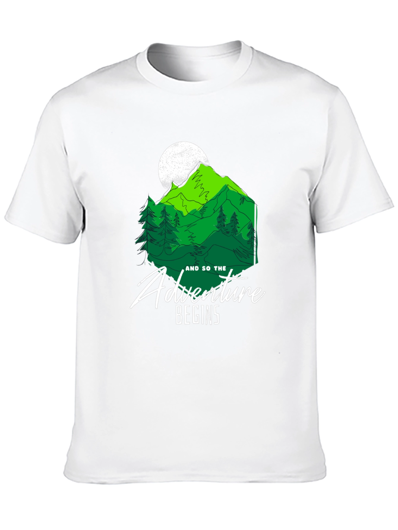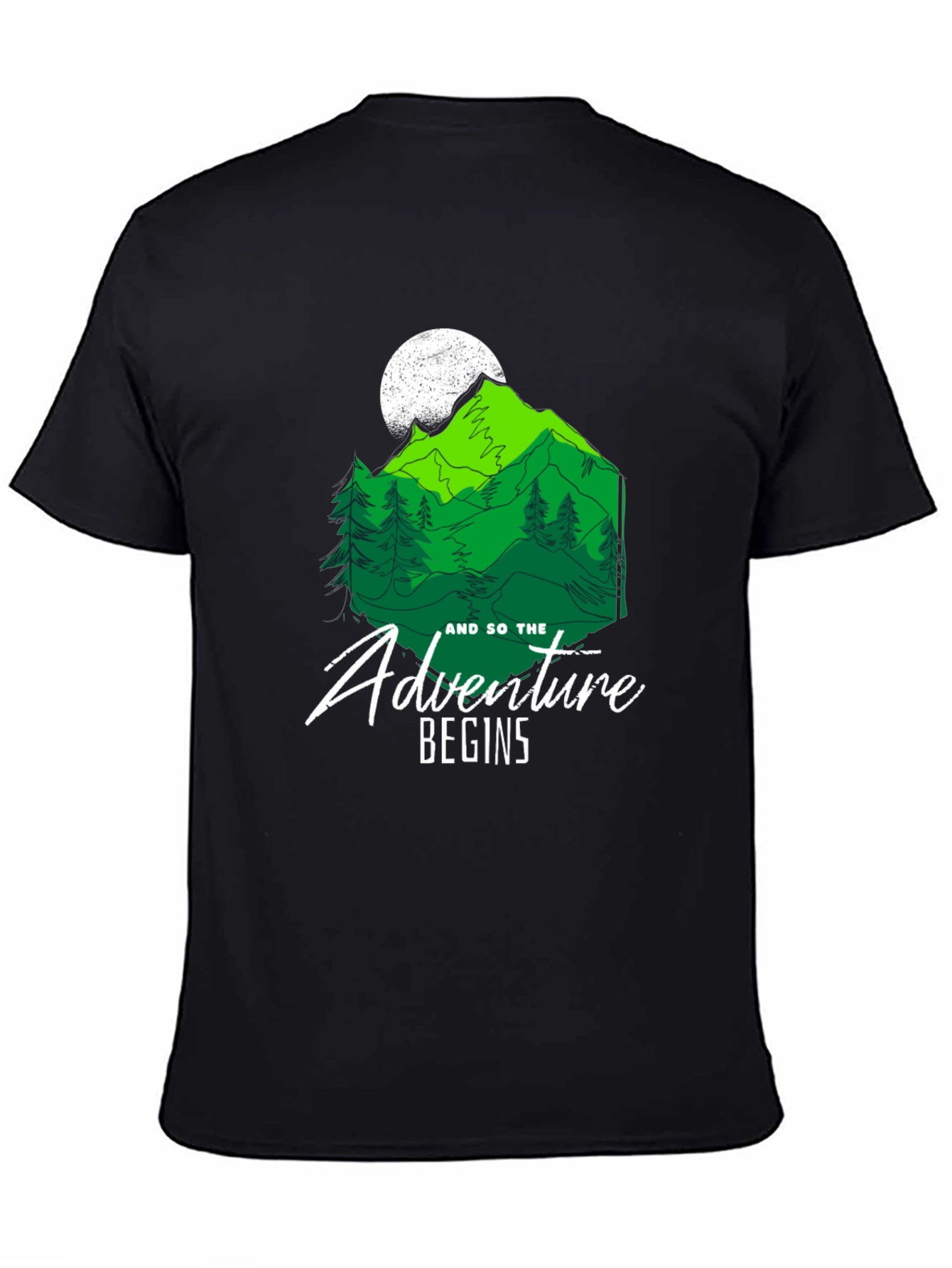 Embrace the call of the wild with this stylish black T-shirt! The design features a vibrant green mountain range under a full moon, complete with pine trees. A crisp white font proclaims, "And so the adventure begins." Made from a soft, comfortable fabric, this tee is ideal for everyday wear or your next outdoor excursion. Show your love for nature and exploration with this unique and eye-catching graphic tee. Perfect for hikers, campers, and anyone with a wanderlust spirit!