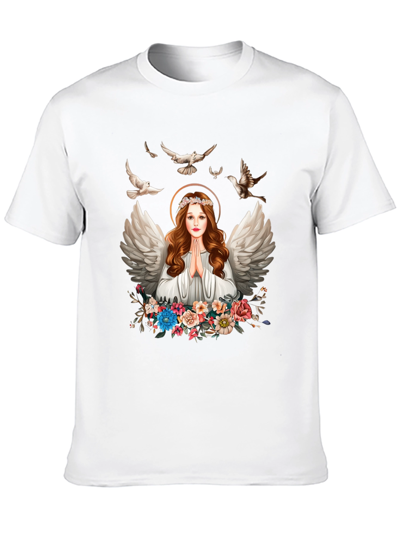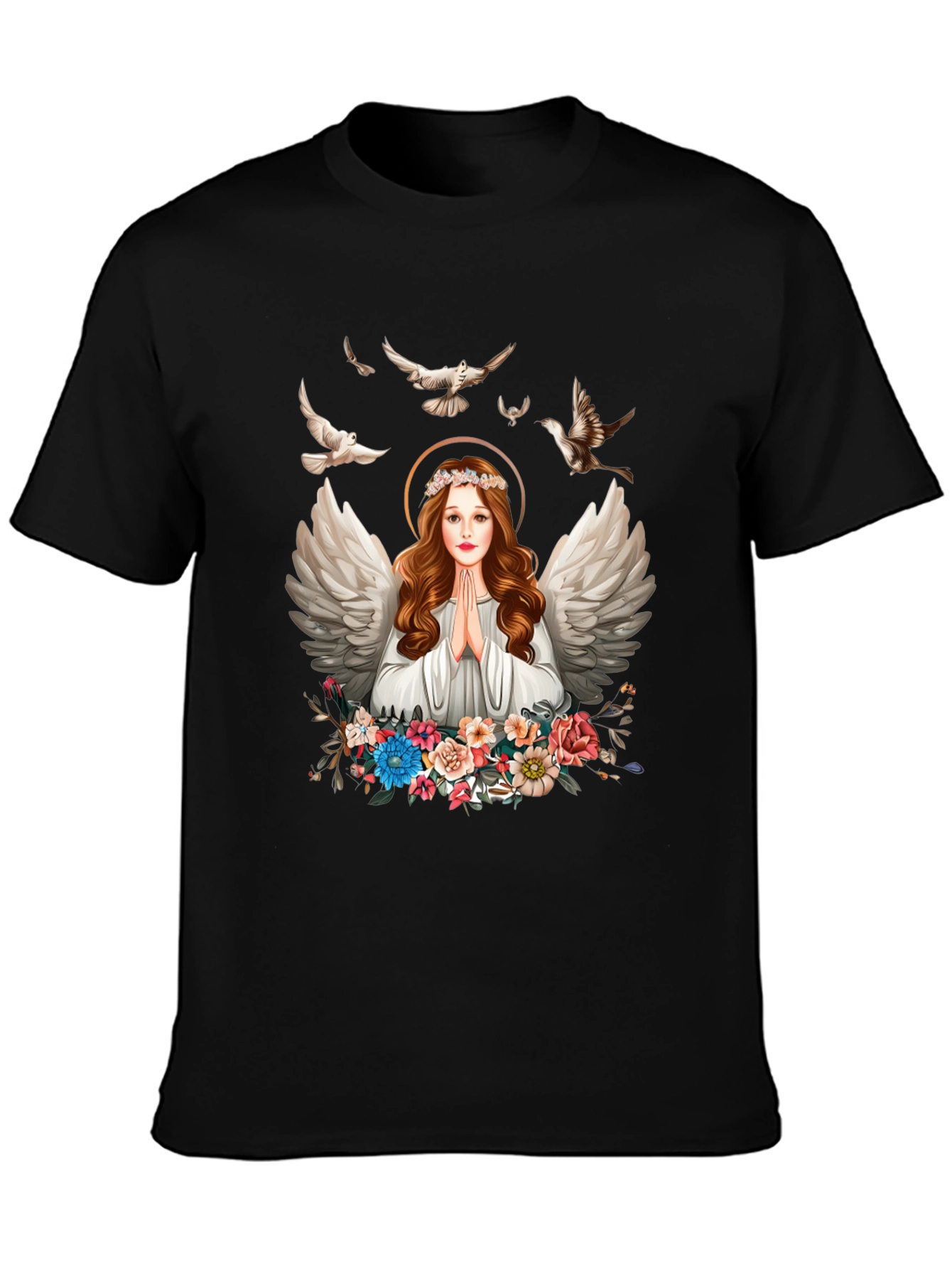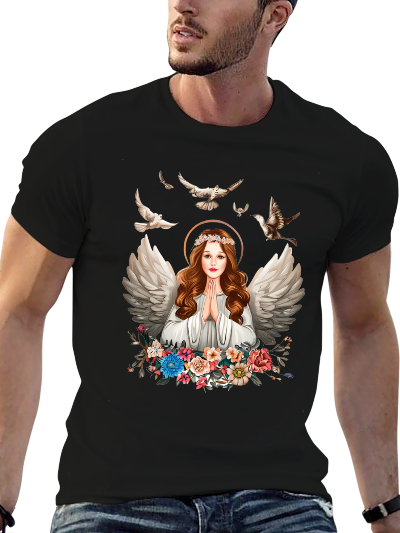 This classic black t-shirt features a beautiful angel design. The graphic showcases an angel with white wings, surrounded by a halo and colorful flowers. Above the angel, white doves add a touch of peace and serenity. Made from a comfortable, breathable fabric, this tee is perfect for everyday wear. Pair it with jeans for a casual look, or dress it up with a blazer for a more polished style. Makes a thoughtful gift for anyone who loves angelic imagery or appreciates spiritual themes.