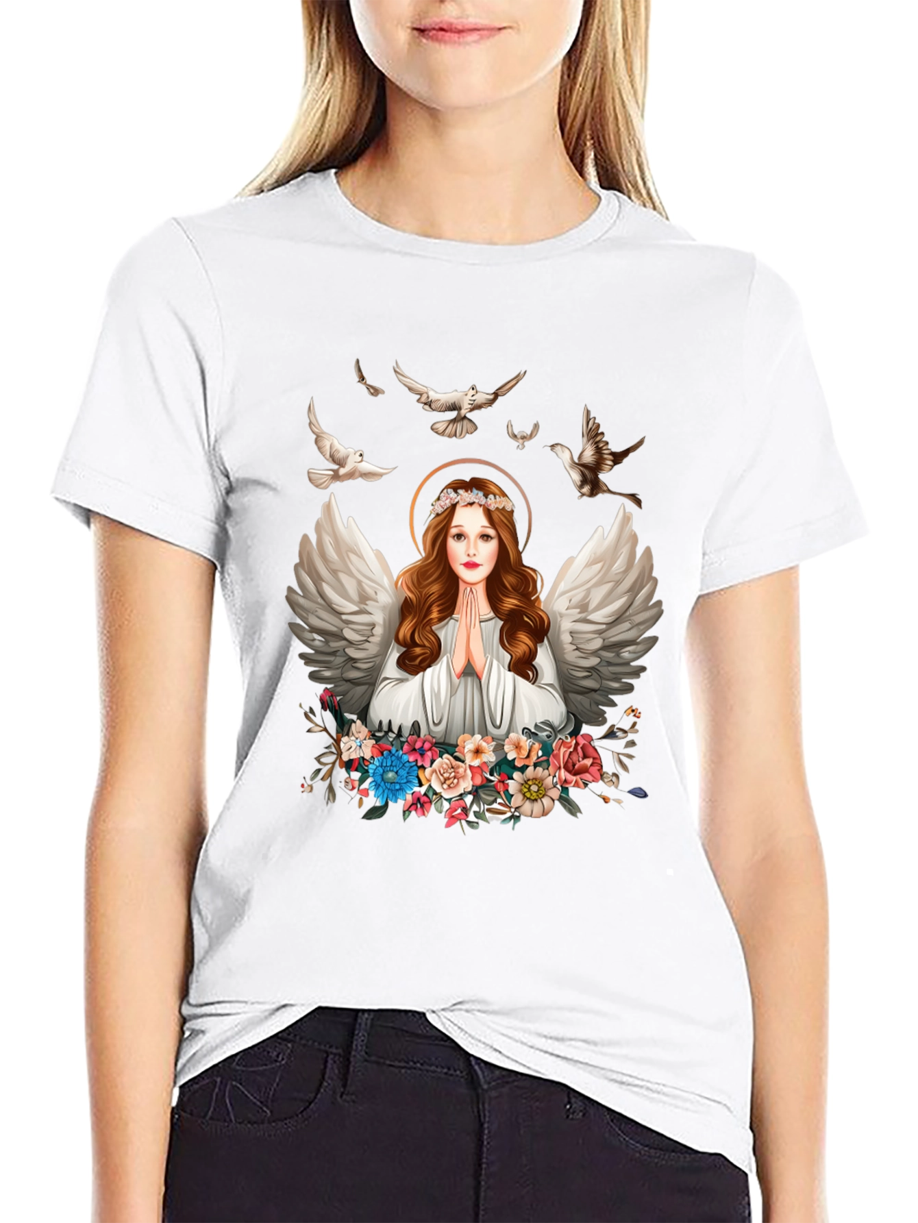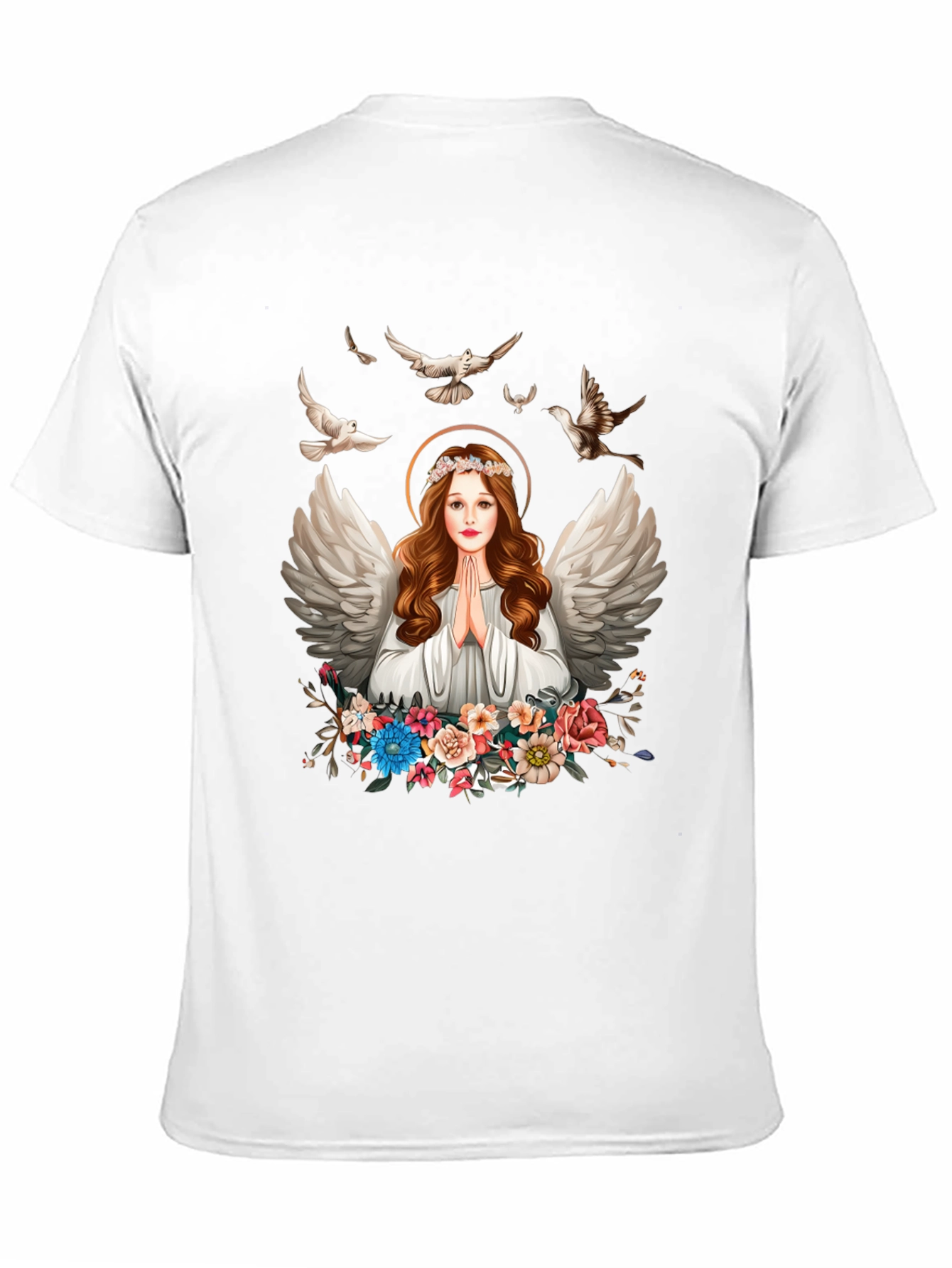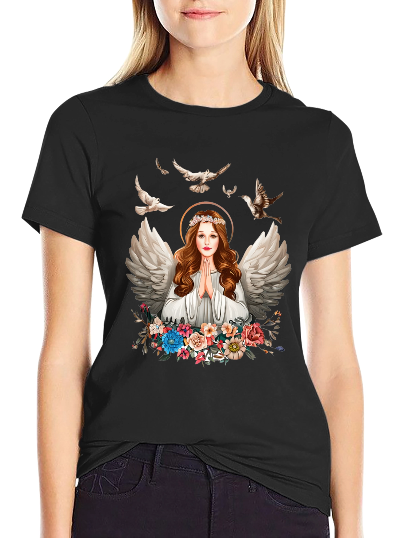 This classic black t-shirt features a beautiful angel design. The graphic showcases an angel with white wings, surrounded by a halo and colorful flowers. Above the angel, white doves add a touch of peace and serenity. Made from a comfortable, breathable fabric, this tee is perfect for everyday wear. Pair it with jeans for a casual look, or dress it up with a blazer for a more polished style. Makes a thoughtful gift for anyone who loves angelic imagery or appreciates spiritual themes.