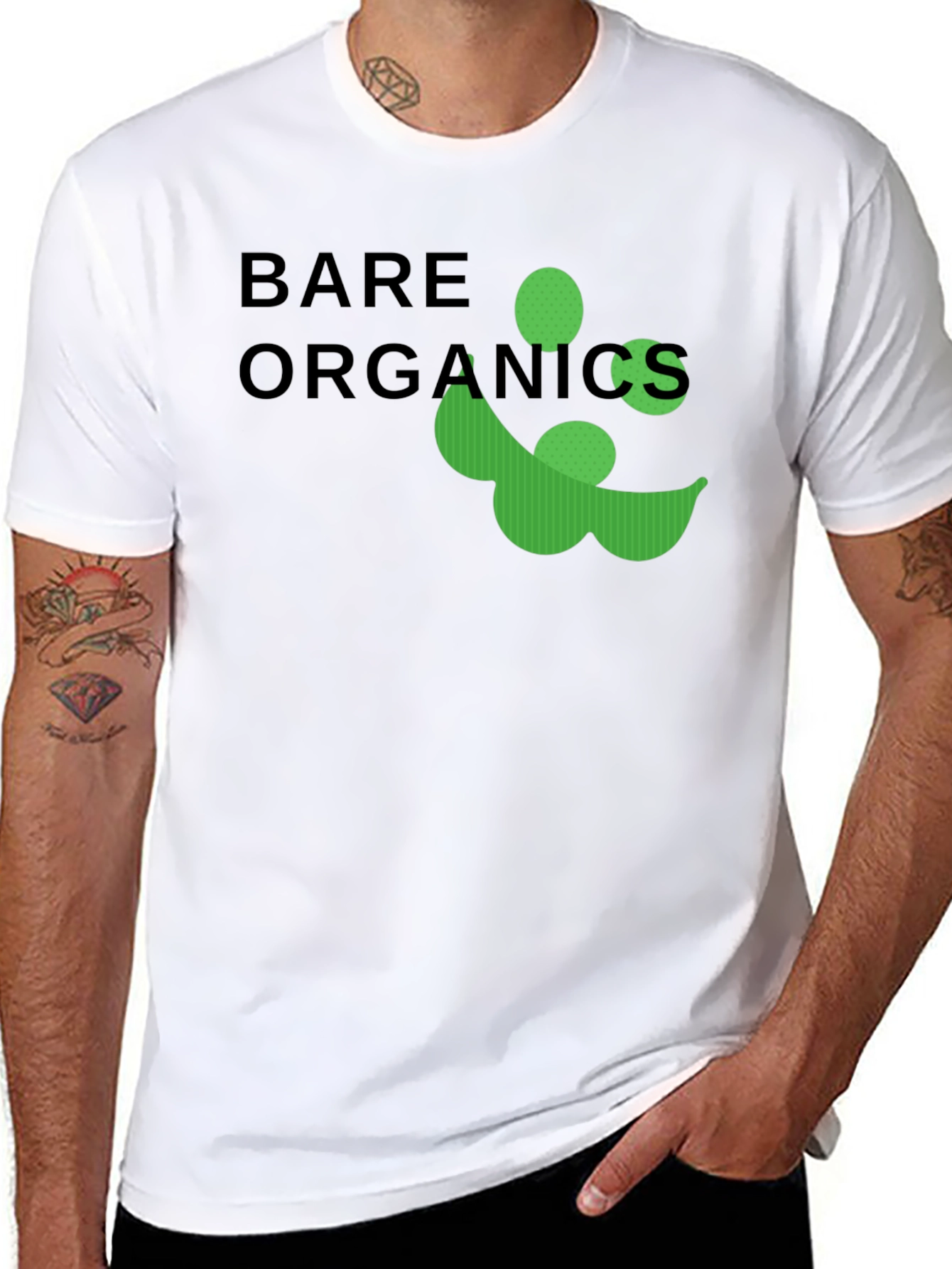 Show your love for organic food with this stylish black graphic tee. Featuring the words "Bare Organics" paired with a playful green pea pod design, this t-shirt is perfect for those who value healthy living and sustainable choices. The clean and simple design makes it versatile for casual wear, whether you're running errands, hitting the gym, or meeting friends for lunch. Made from comfortable materials, it ensures a great fit and all-day comfort. Wear your values with pride in this unique and eye-catching organic-themed t-shirt.