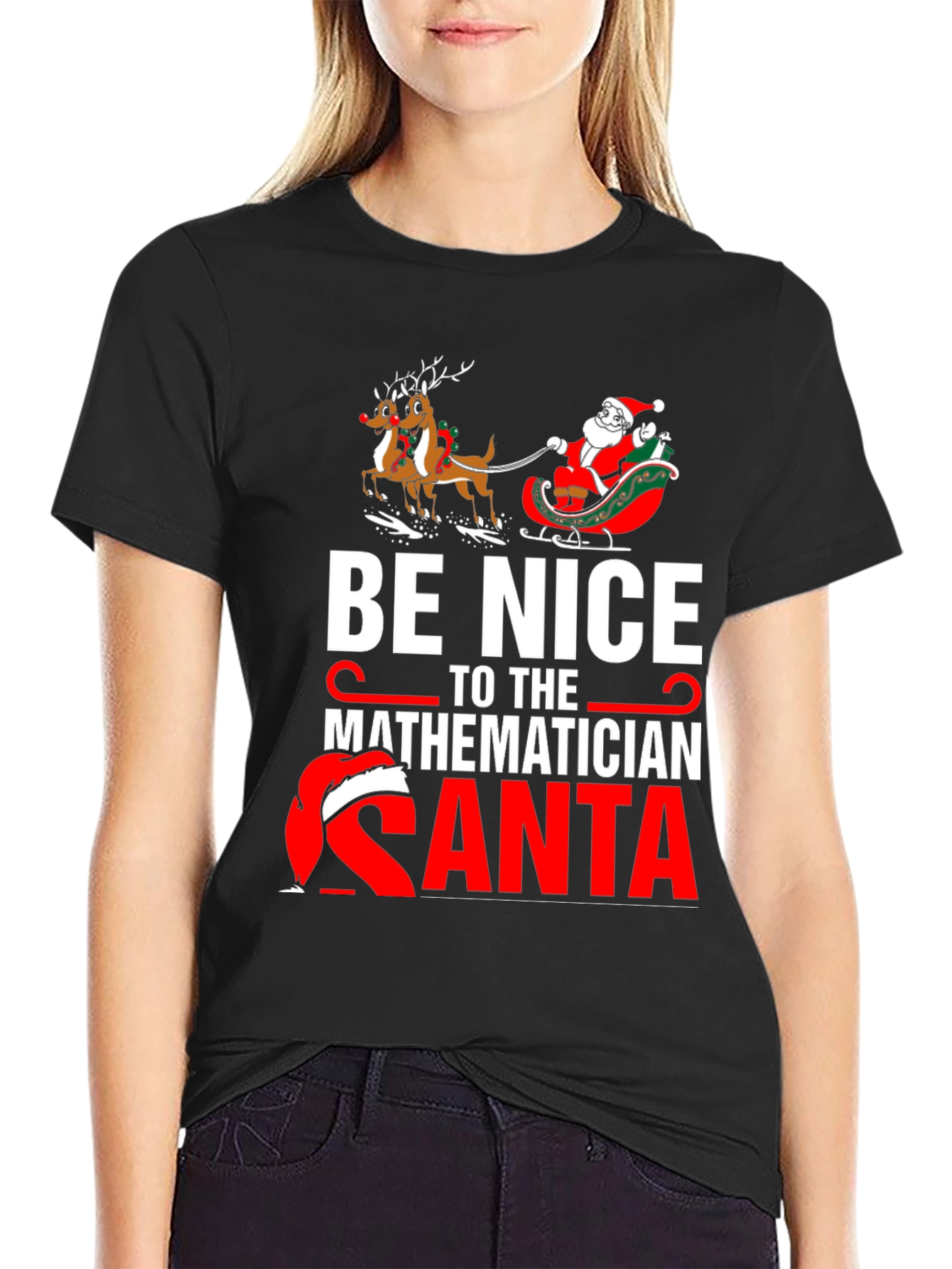 Spread holiday cheer with this unique black T-shirt! Featuring a playful design with Santa in his sleigh pulled by reindeer, accompanied by the humorous message "Be Nice to the Mathematician Santa", this shirt is a fun addition to any wardrobe. The design is printed in vibrant colors, and the fabric appears to be a comfortable cotton blend, perfect for everyday wear or festive occasions. Show off your love for math and the holiday season simultaneously with this eye-catching tee. Great for Christmas parties, casual outings, or as a quirky gift for the math enthusiast in your life. Get yours today!