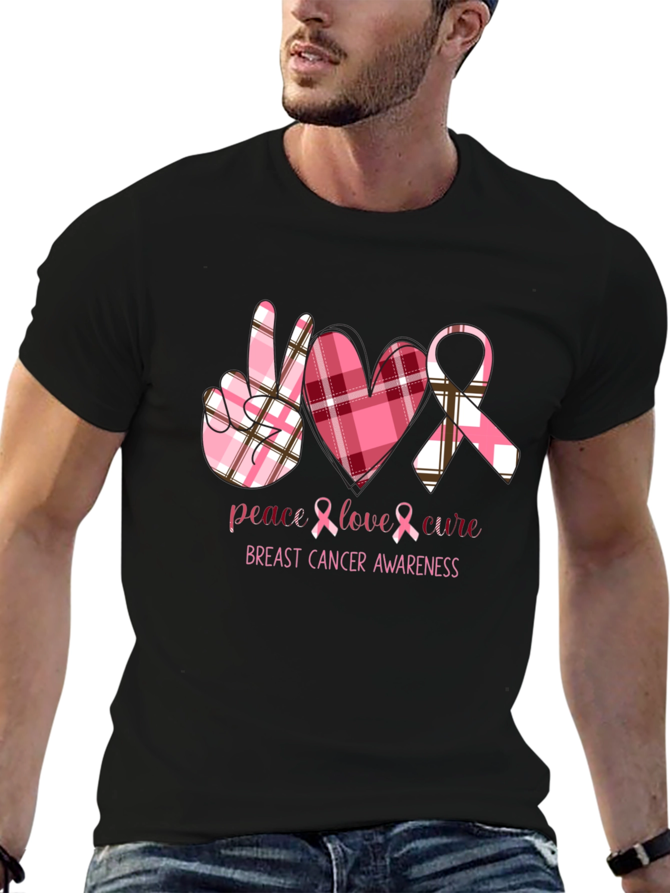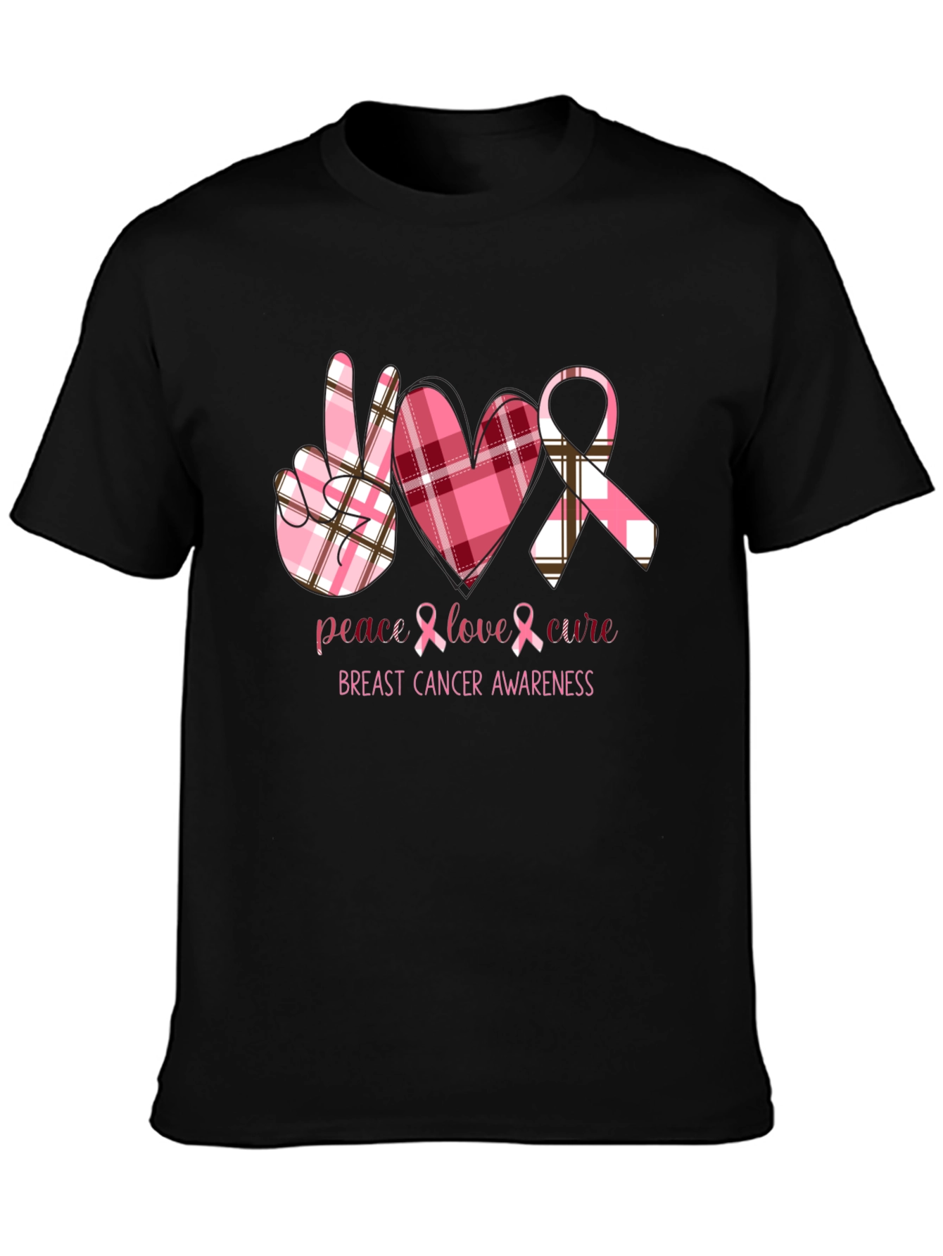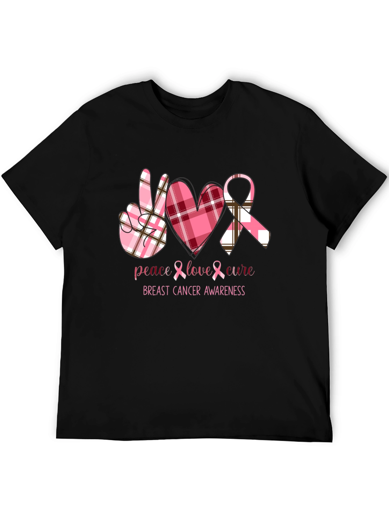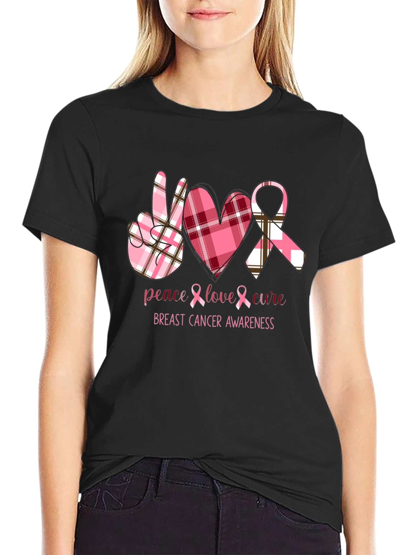 Show your support with this black graphic tee! The design features a patchwork-style peace sign, heart, and breast cancer awareness ribbon, along with the words "peace, love, cure" and "BREAST CANCER AWARENESS" in pink font. Perfect for walks, charity events, or everyday wear. This tee is a stylish way to raise awareness and show your solidarity! A comfortable and fashionable addition to any wardrobe.