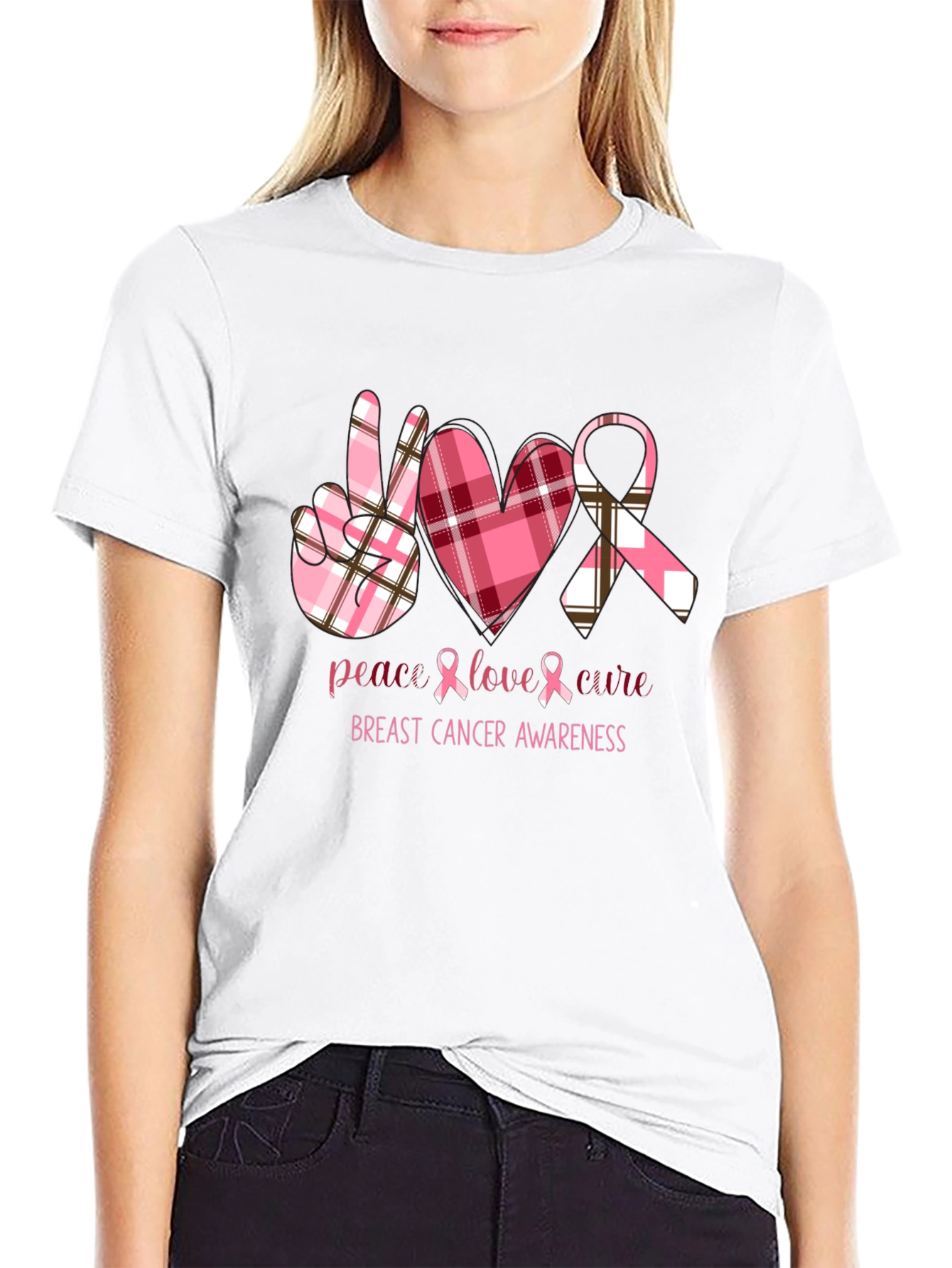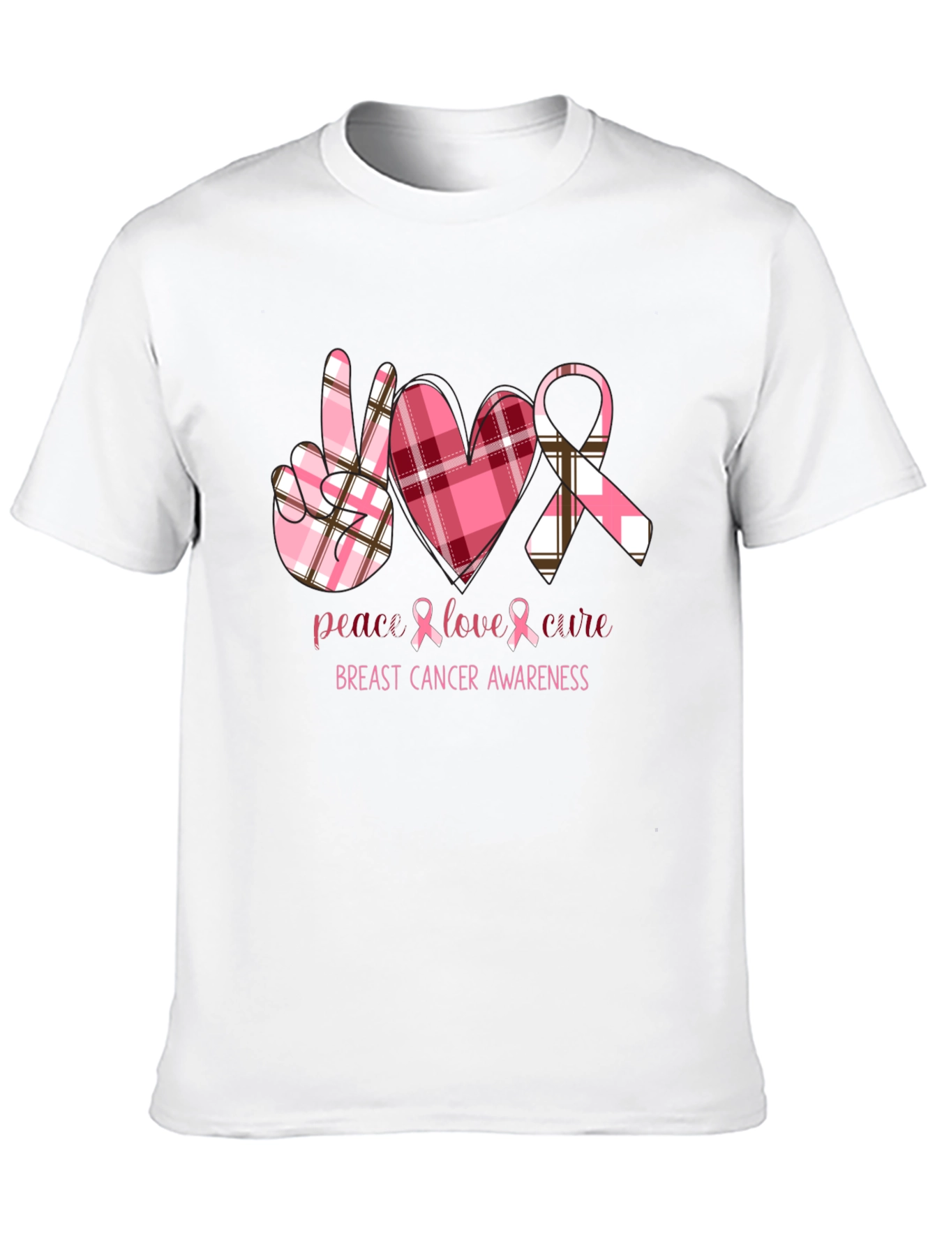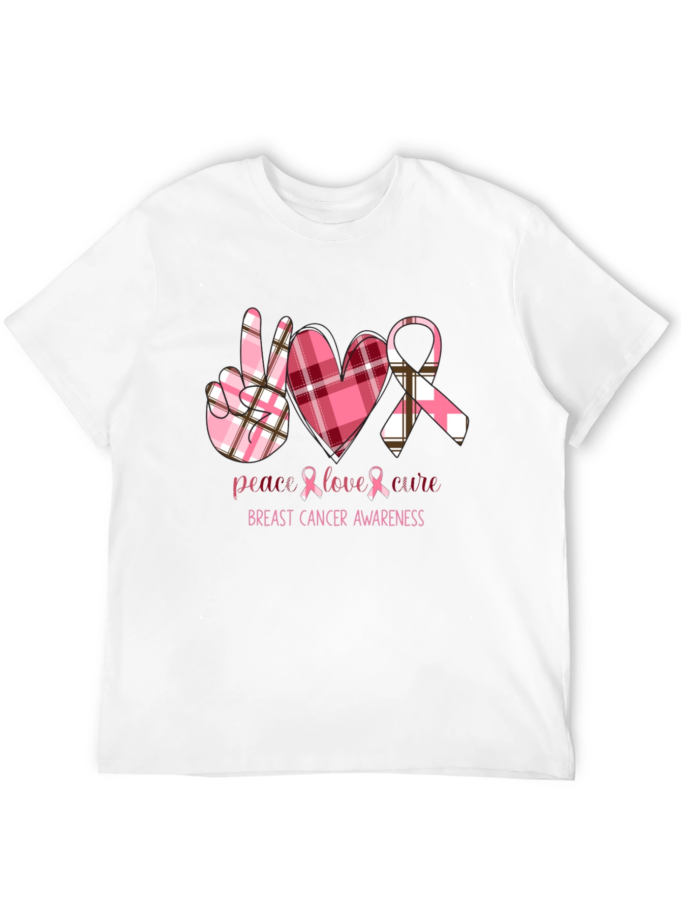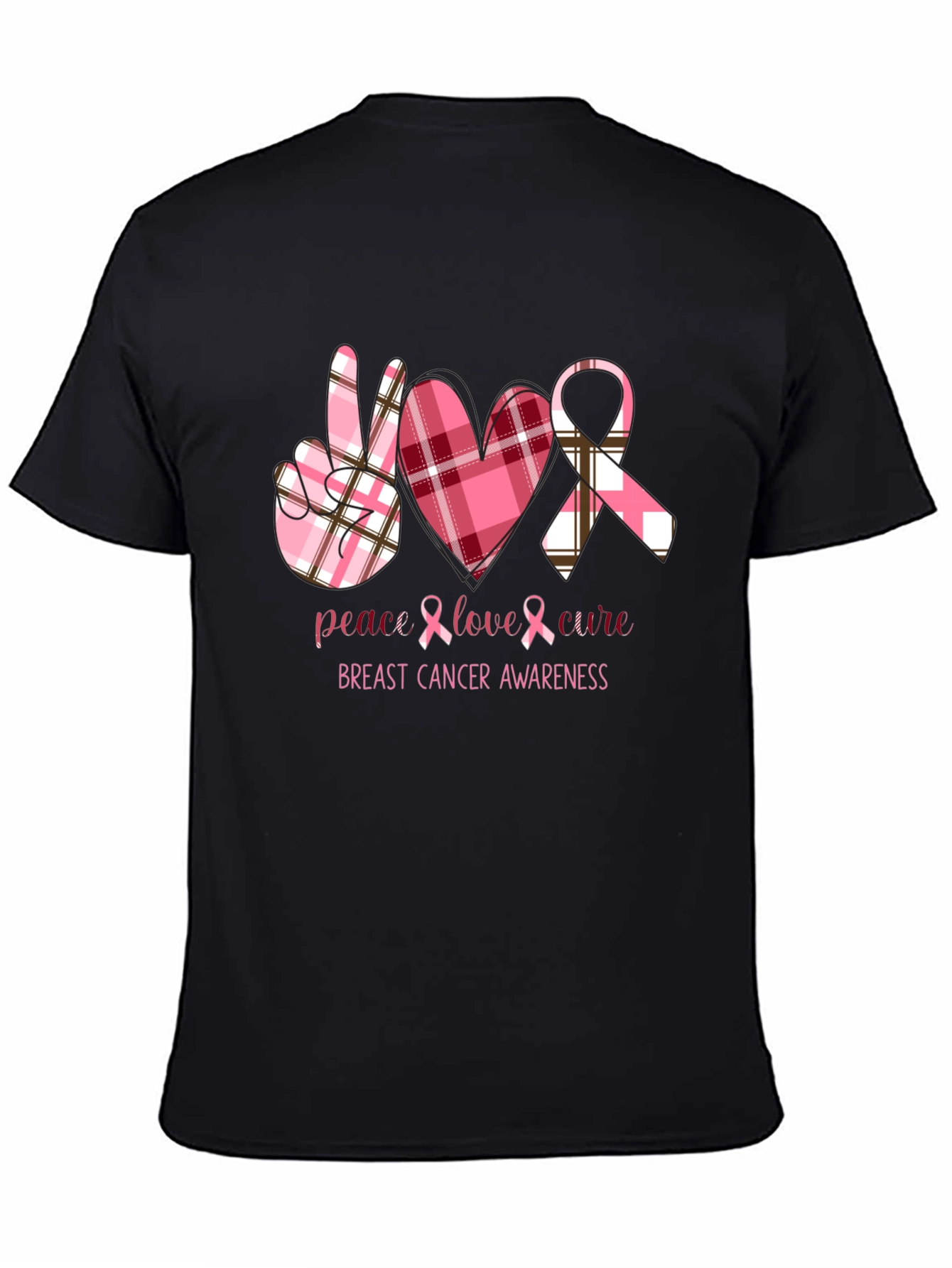 Show your support with this black graphic tee! The design features a patchwork-style peace sign, heart, and breast cancer awareness ribbon, along with the words "peace, love, cure" and "BREAST CANCER AWARENESS" in pink font. Perfect for walks, charity events, or everyday wear. This tee is a stylish way to raise awareness and show your solidarity! A comfortable and fashionable addition to any wardrobe.