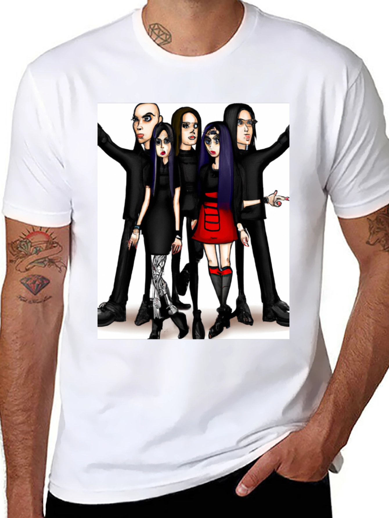 Show off your unique style with this bold black T-shirt. The shirt features a vibrant cartoon graphic print of a goth band. The detailed graphic adds an edgy and artistic flair to your wardrobe. Made from soft, breathable fabric, this tee ensures all-day comfort. Pair it with your favorite jeans or shorts for a casual yet stylish look. Perfect for expressing your individuality and love for alternative aesthetics, this T-shirt is a must-have addition to any modern wardrobe.