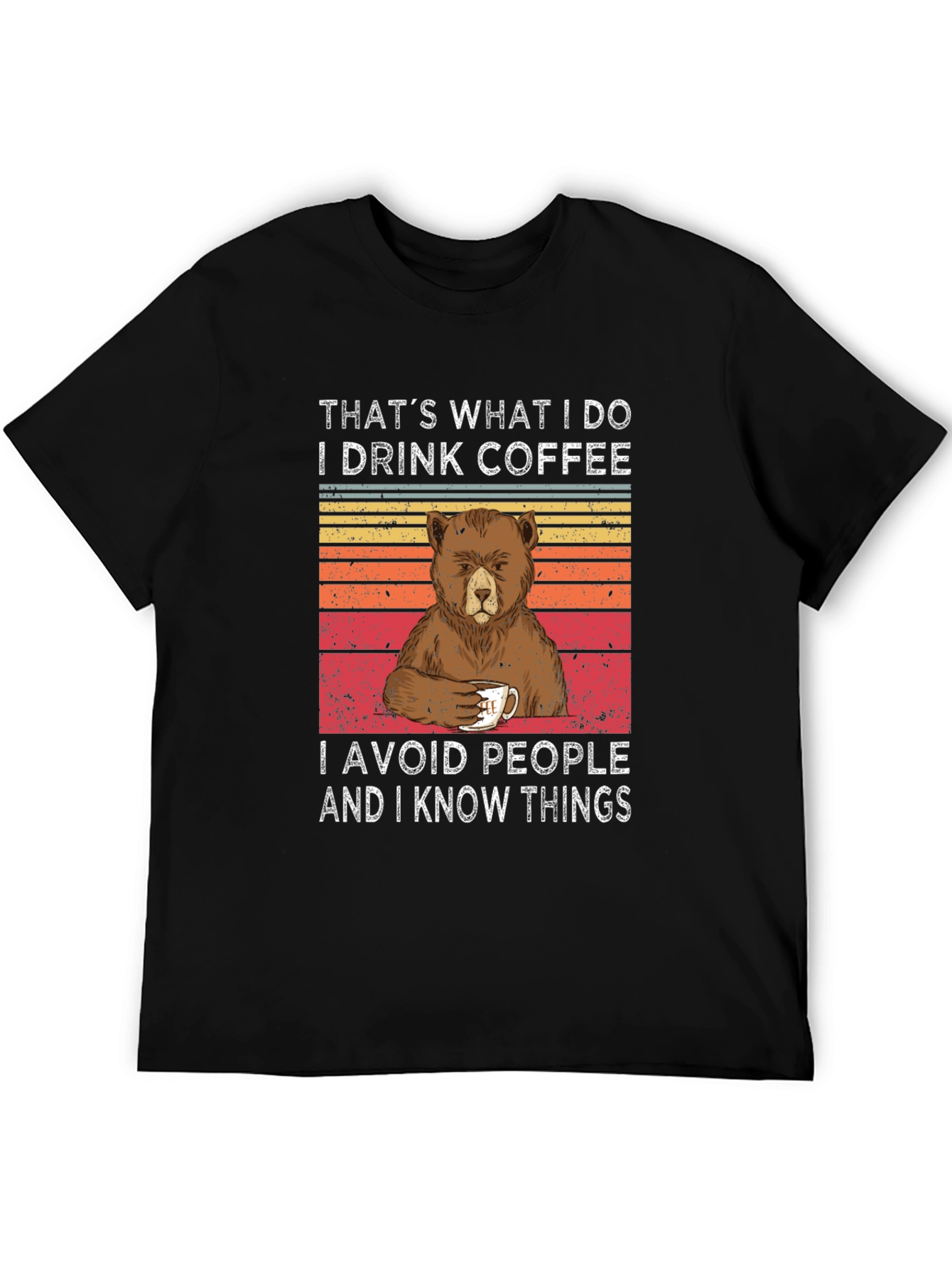 This stylish black t-shirt features a humorous and relatable design for coffee lovers and introverts. The graphic displays a cartoon bear holding a coffee cup, set against a vintage-style striped background. Above and below the bear, the witty text reads: "That's What I Do I Drink Coffee, I Avoid People and I Know Things." Crafted from a soft, comfortable fabric, this tee offers a relaxed fit perfect for everyday wear. Ideal for casual outings, lounging at home, or expressing your unique personality. A great conversation starter and a fun addition to any wardrobe!