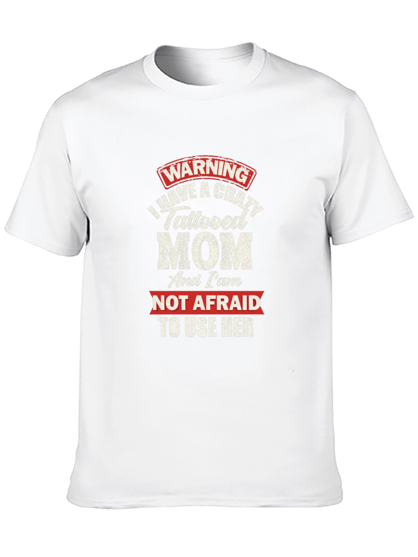 Show off your love for your amazing mom with this eye-catching graphic tee! This black t-shirt features a bold design with the phrase "WARNING I HAVE A CRAZY Tattooed MOM And I'm NOT AFRAID TO USE HER". The distressed vintage-style print adds a touch of edgy charm. Made from a comfortable material, this shirt is perfect for everyday wear. Makes a great gift for proud children or for the tattooed mom herself! Wear it to family gatherings, casual outings, or just to express your unique personality.
