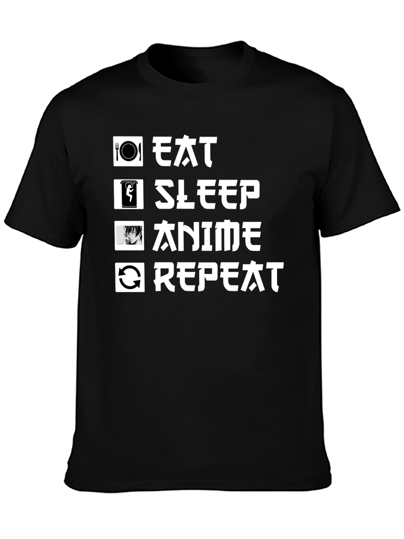 Show off your love for anime with this stylish graphic tee. The black t-shirt features a white graphic design displaying 'Eat, Sleep, Anime, Repeat' along with accompanying icons, perfect for anime enthusiasts. Made from a comfortable, breathable fabric, this shirt is ideal for everyday wear, conventions, or lounging at home while binging your favorite shows. A must-have addition to any anime fan's wardrobe. Wear it and express your passions.