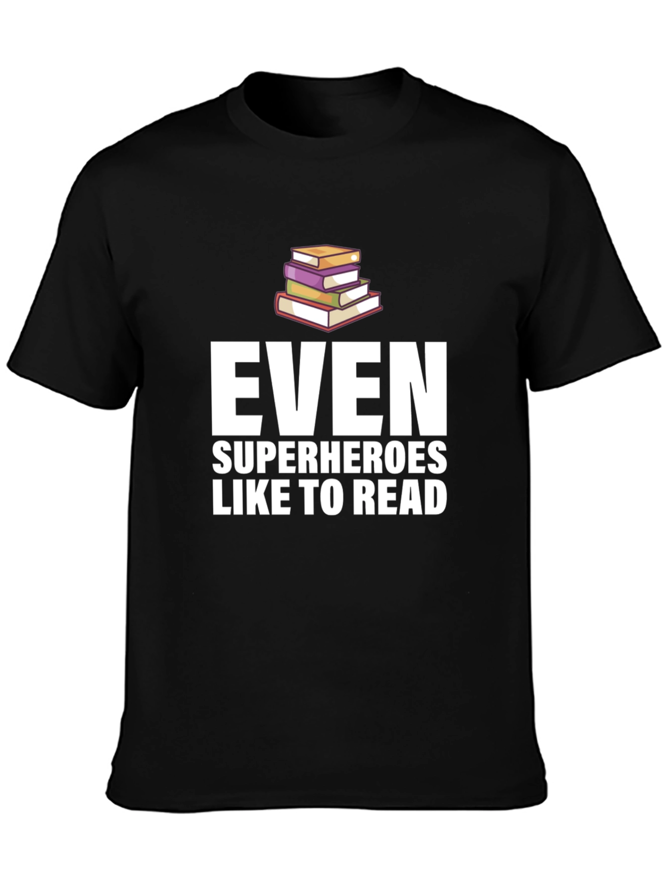 Show off your love for reading with this unique graphic t-shirt. The shirt features a stack of books graphic above the text "EVEN SUPERHEROES LIKE TO READ" printed in a bold, white font. The design is perfect for book lovers of all ages. This casual tee is made from a soft fabric and is suitable for everyday wear. It is ideal for wearing to school, library or bookstore. It makes a great gift for librarians, teachers, or anyone who enjoys a good book.
