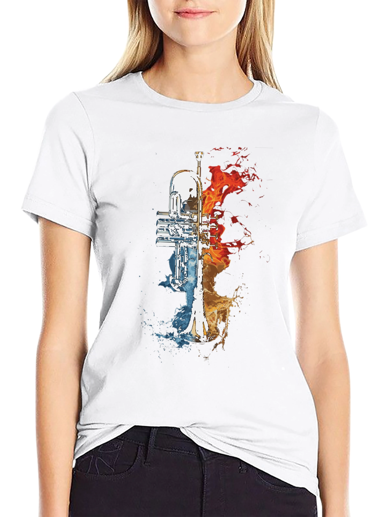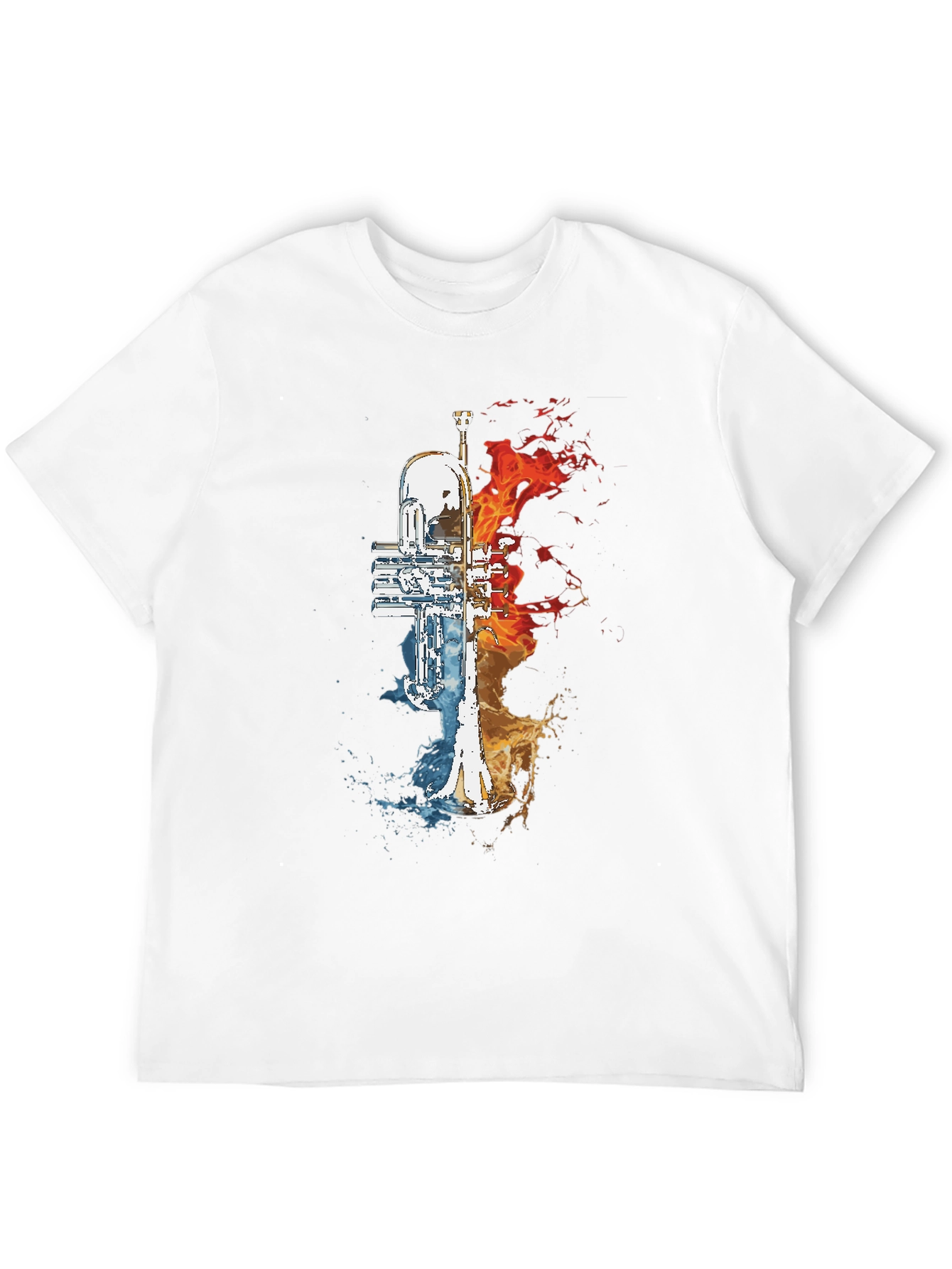 Make a statement with this striking black t-shirt featuring a unique trumpet graphic. The design is split with vibrant fire on one half and cool water on the other, creating a dynamic and eye-catching contrast. The print is high-quality and vibrant, ensuring it stands out. This tee is perfect for musicians, music lovers, or anyone who appreciates bold and creative designs. Made from comfortable and breathable fabric, it's ideal for everyday wear, concerts, or casual outings. Elevate your style with this standout graphic tee that is sure to spark conversation.