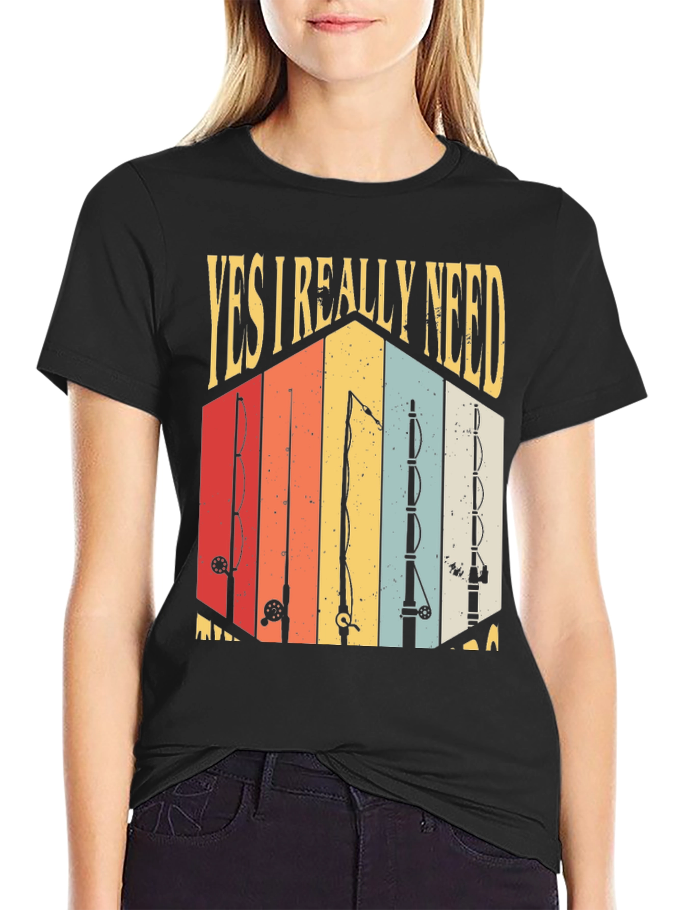 Show off your love for fishing with this stylish retro-themed graphic t-shirt. The shirt features a cool, vintage-inspired design with various fishing rod silhouettes set against a colorful striped background. The words "YES I REALLY NEED" arch above the graphic. Made from a comfortable, breathable fabric, this tee is perfect for casual wear. Whether you're heading out on a fishing trip or just want to show your passion for the sport, this t-shirt is a must-have. It’s a great gift for anglers and anyone who enjoys spending time outdoors. Available in a classic fit, this shirt offers both comfort and style.