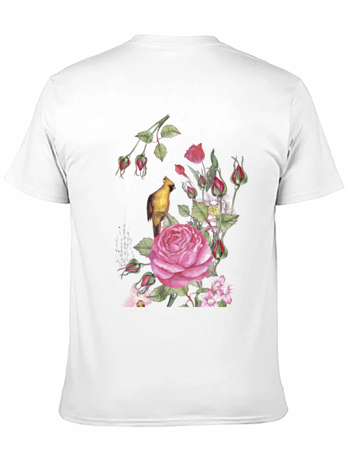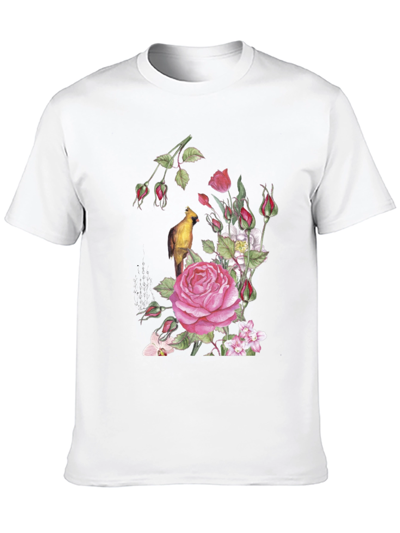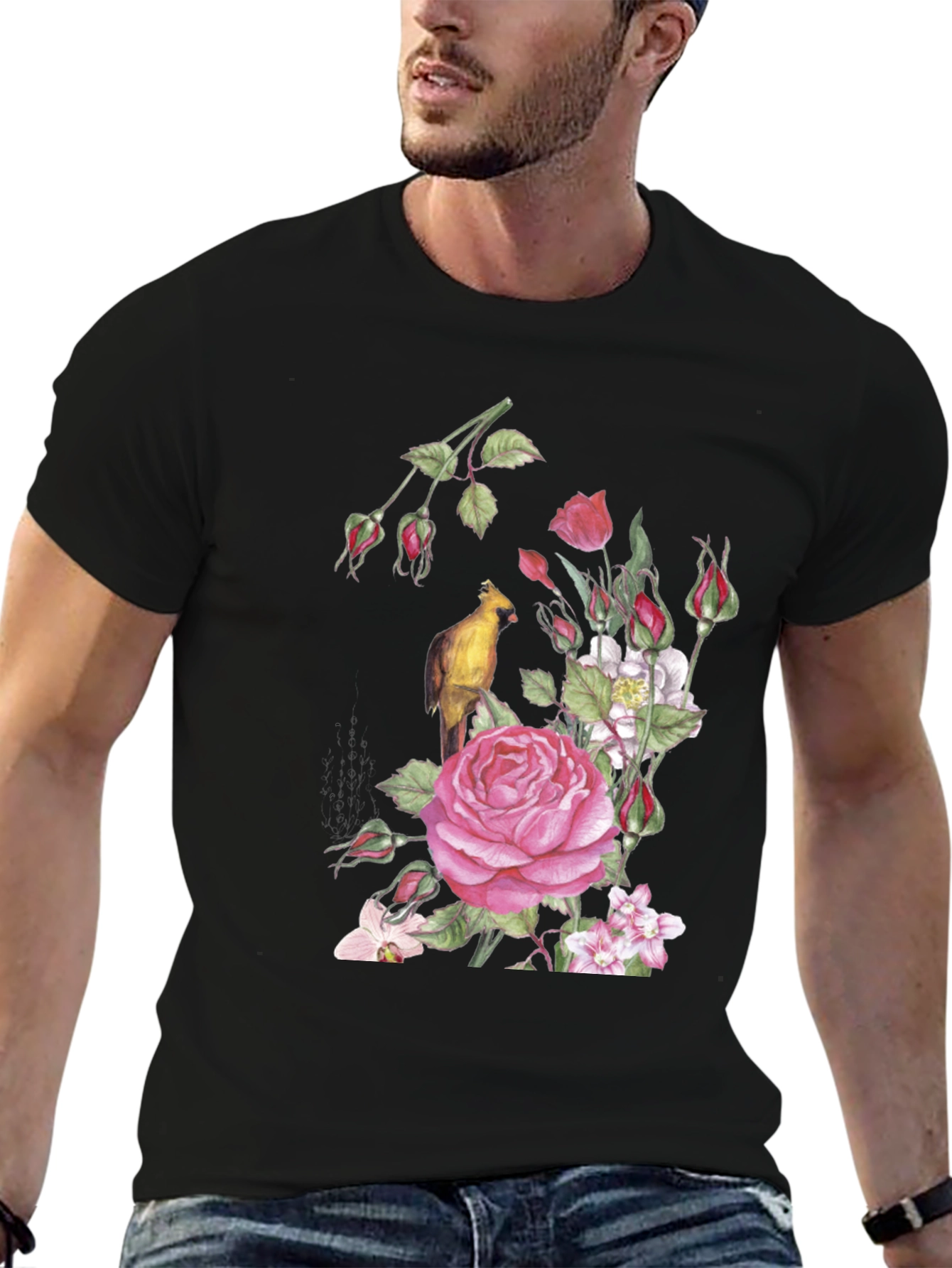 This classic black t-shirt features a vibrant floral and bird print. The design includes a mix of roses, other flowers, and a yellow bird, creating a colorful and eye-catching contrast against the black backdrop. Made from a comfortable-looking fabric, this shirt is ideal for casual wear. Perfect for adding a touch of nature-inspired style to your everyday wardrobe. This unique t-shirt would also make a thoughtful gift for bird and flower lovers alike. The print is large and centered, ensuring it stands out. Pair it with jeans or shorts for a relaxed, stylish look.