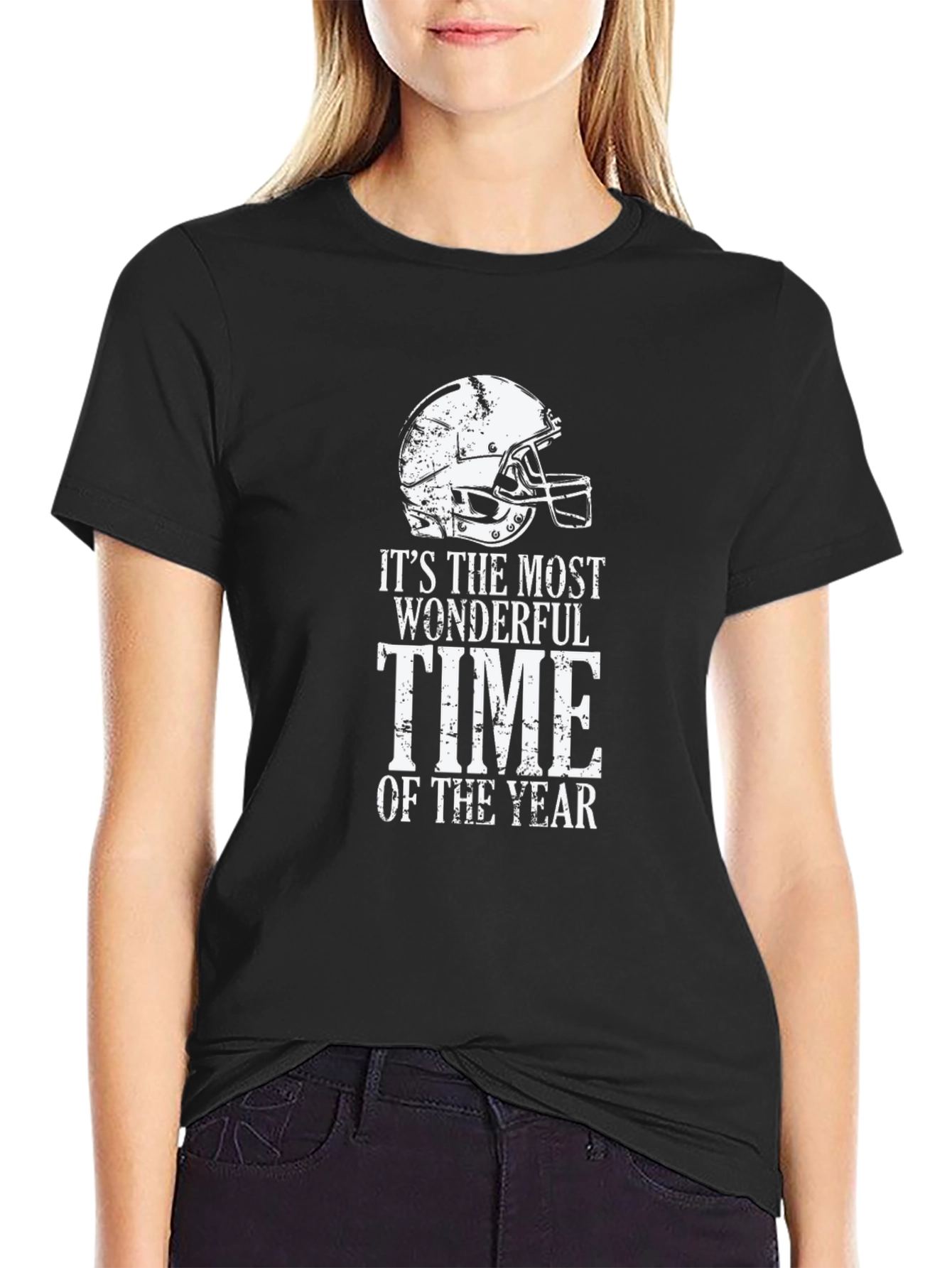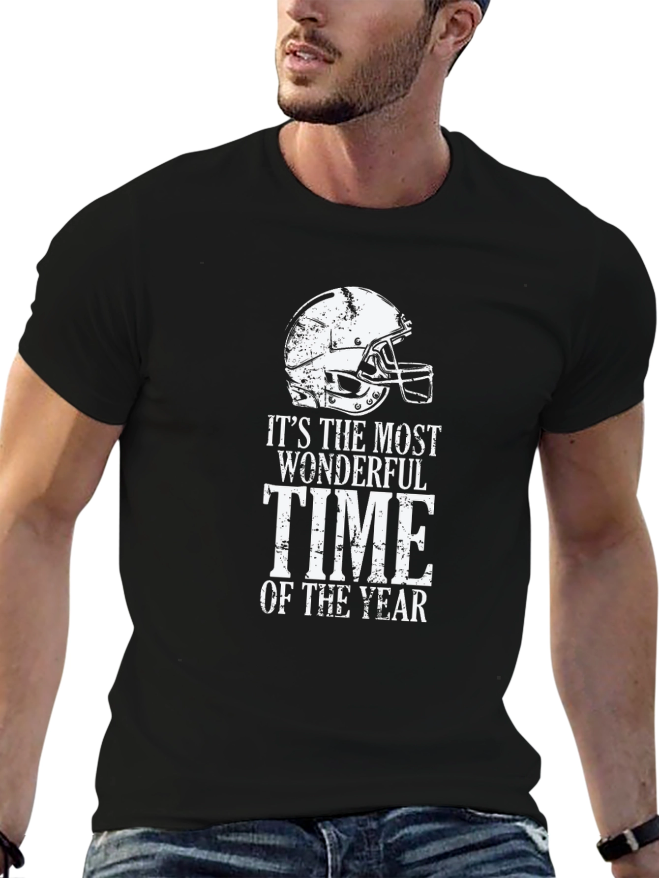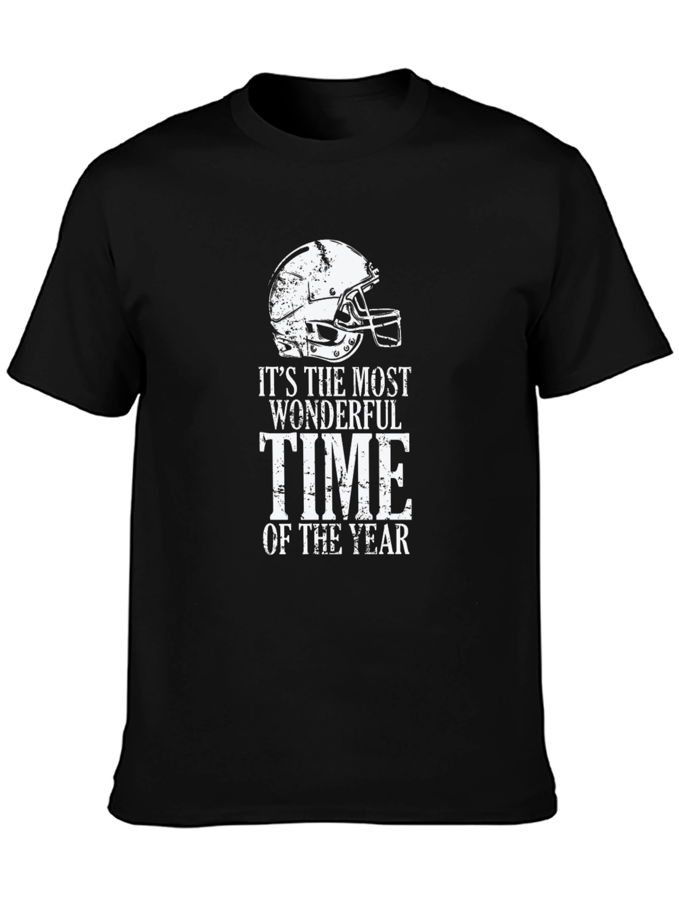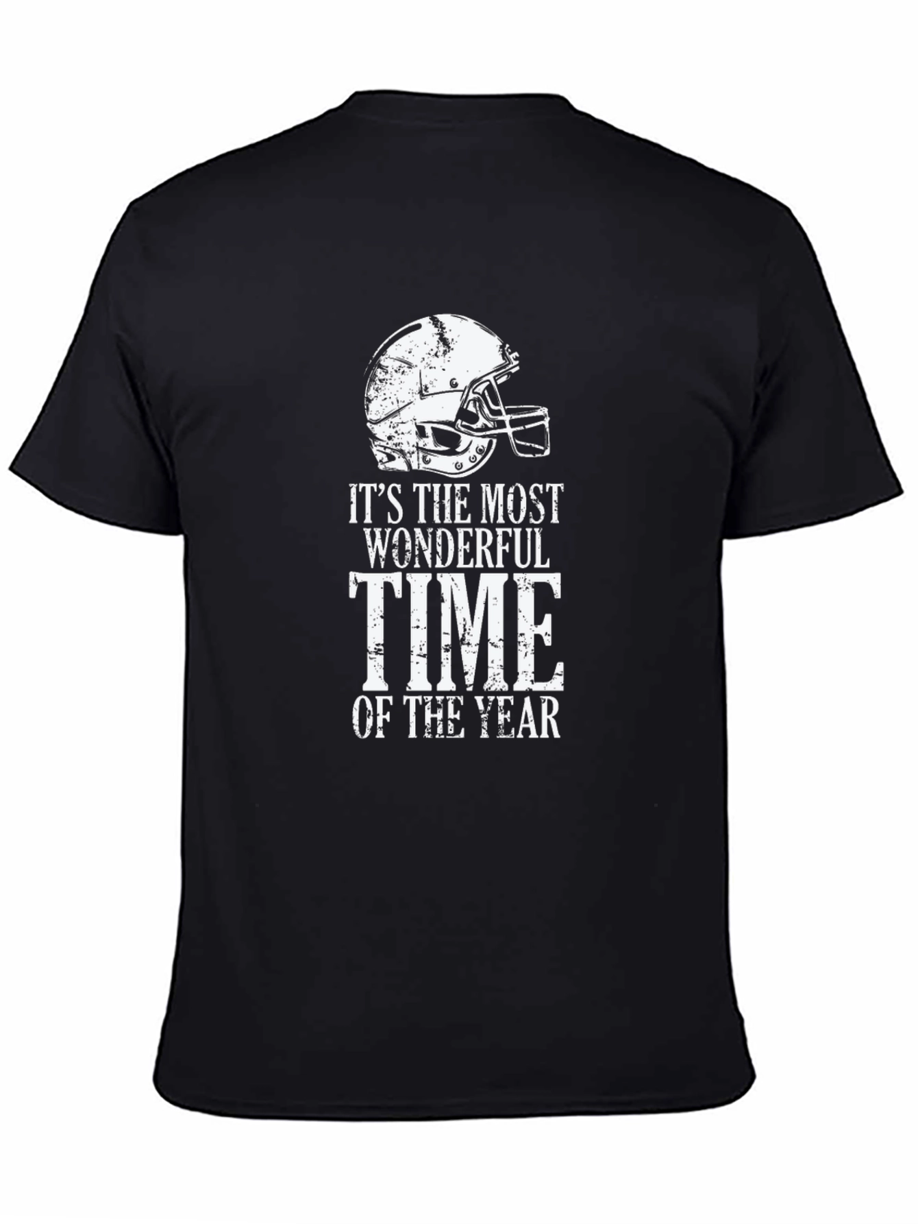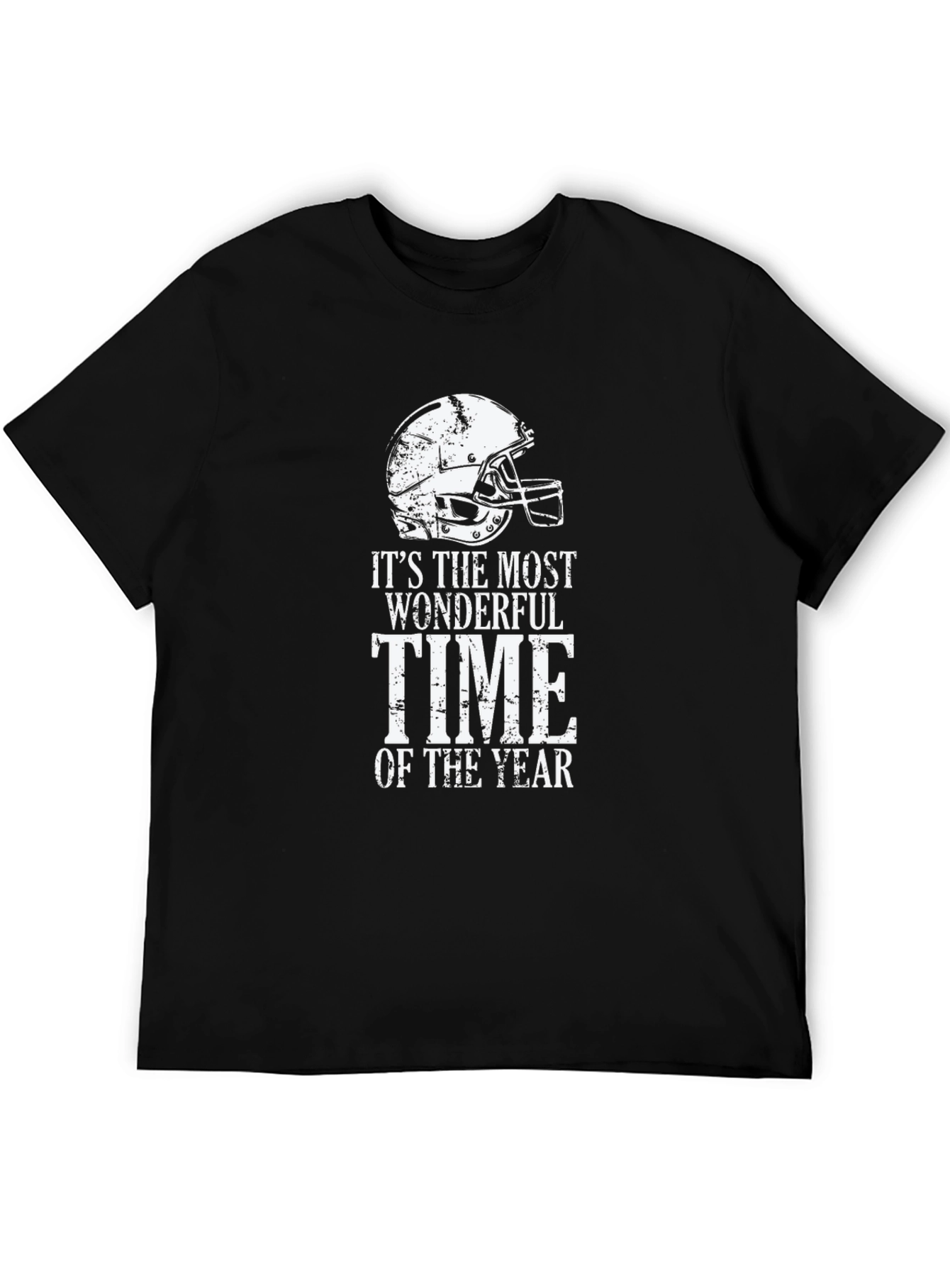 Celebrate football season with this stylish black t-shirt! This crewneck tee features a distressed white graphic of a football helmet and the phrase, "It's The Most Wonderful Time Of The Year." Made from a soft-looking fabric, this short-sleeved shirt offers both comfort and style. Perfect for game days, tailgates, or casual wear, show off your love for football in a unique way. This eye-catching design makes it a great conversation starter for any football fan, wear yours with pride and celebrate every exciting moment of the season.