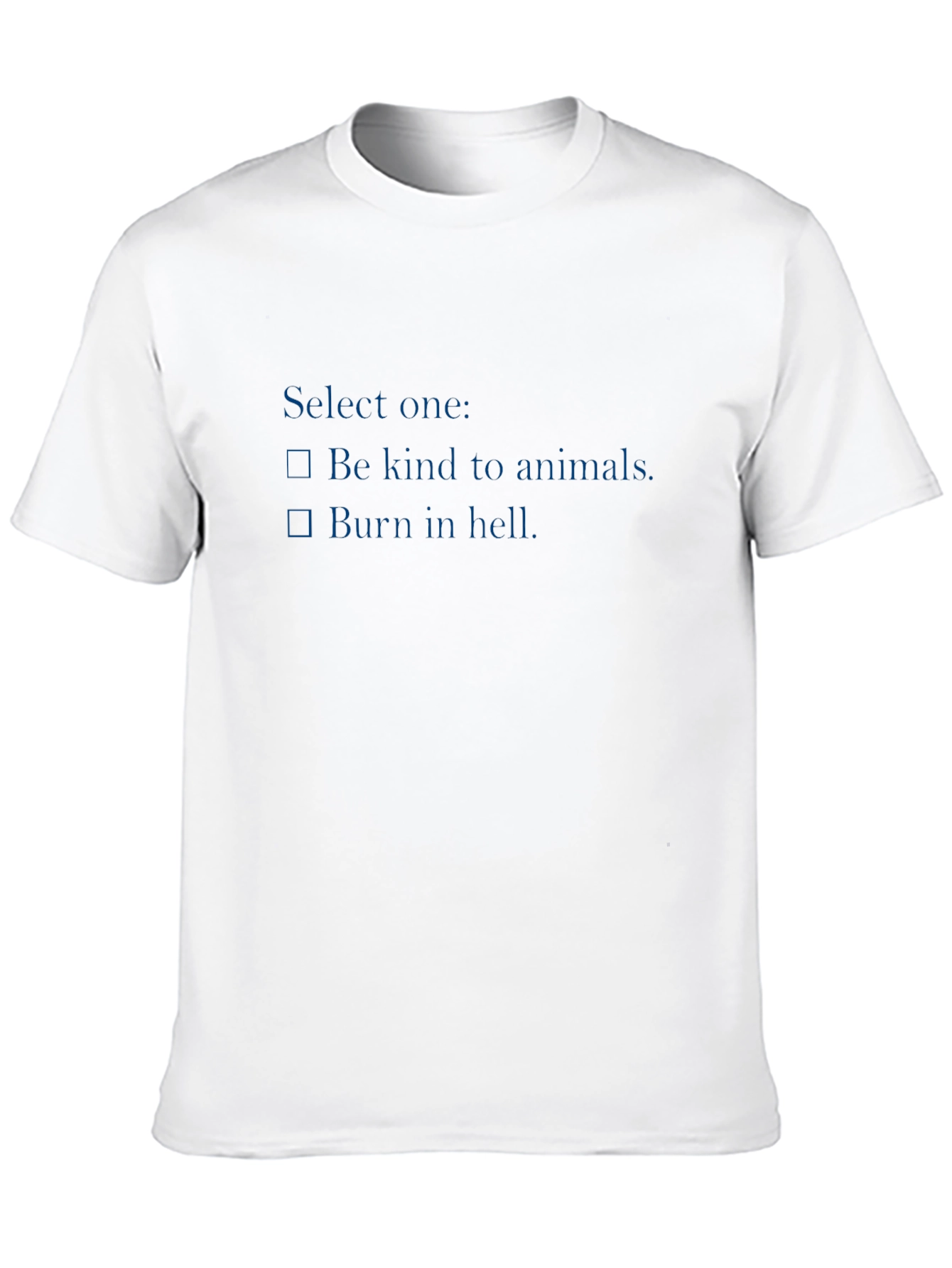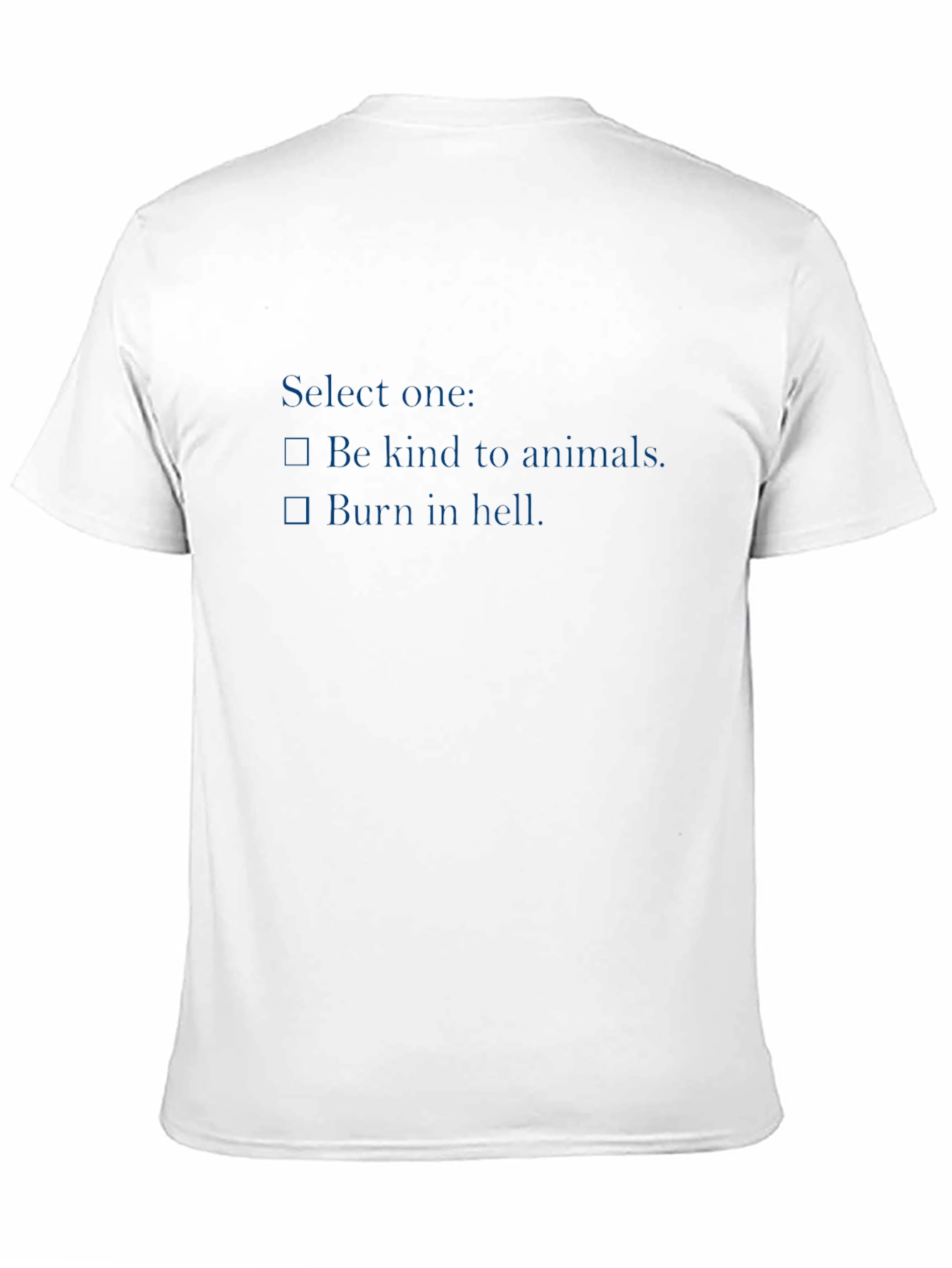 Make a statement with this edgy and humorous black t-shirt. Featuring a bold graphic that says "Select one:" followed by checkboxes for "Be kind to animals." and "Burn in hell.", this tee is sure to turn heads and spark conversations. The design is printed in a dark blue font, creating a cool contrast against the black backdrop. Made from a soft and comfortable fabric, this shirt is perfect for casual wear. It's an ideal choice for those who appreciate dark humor and want to express their unique personality. Wear it to parties, concerts, or just while hanging out with friends and get ready to make a bold statement!
