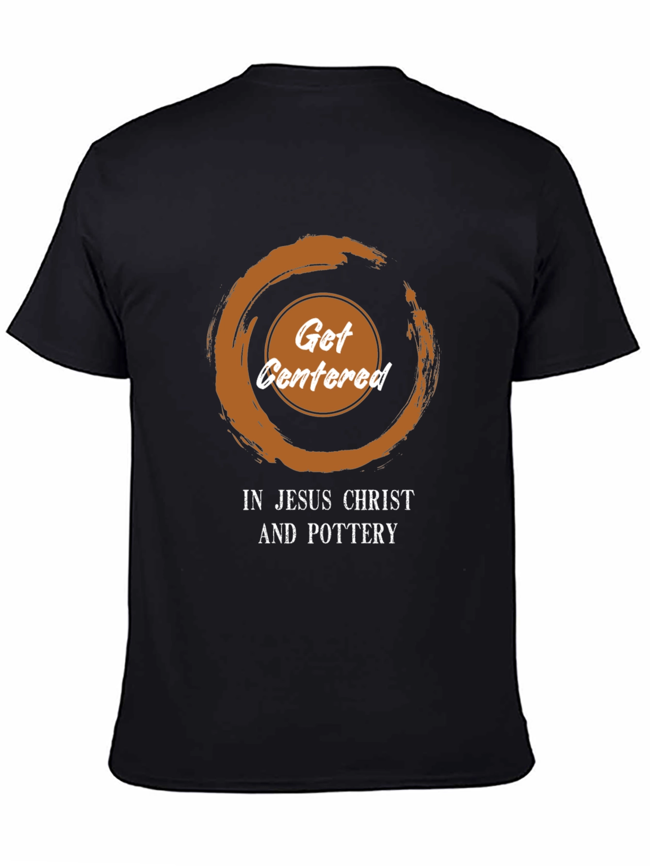 This classic fit black t-shirt features a unique design. A circular brown brushstroke frames the phrase "Get Centered" in a stylish font. Below, the words "IN JESUS CHRIST AND POTTERY" are displayed, suggesting a connection between faith and art. Made from comfortable material, this tee is perfect for casual wear or expressing your spiritual side. Show off your love for pottery and faith with this eye-catching t-shirt.