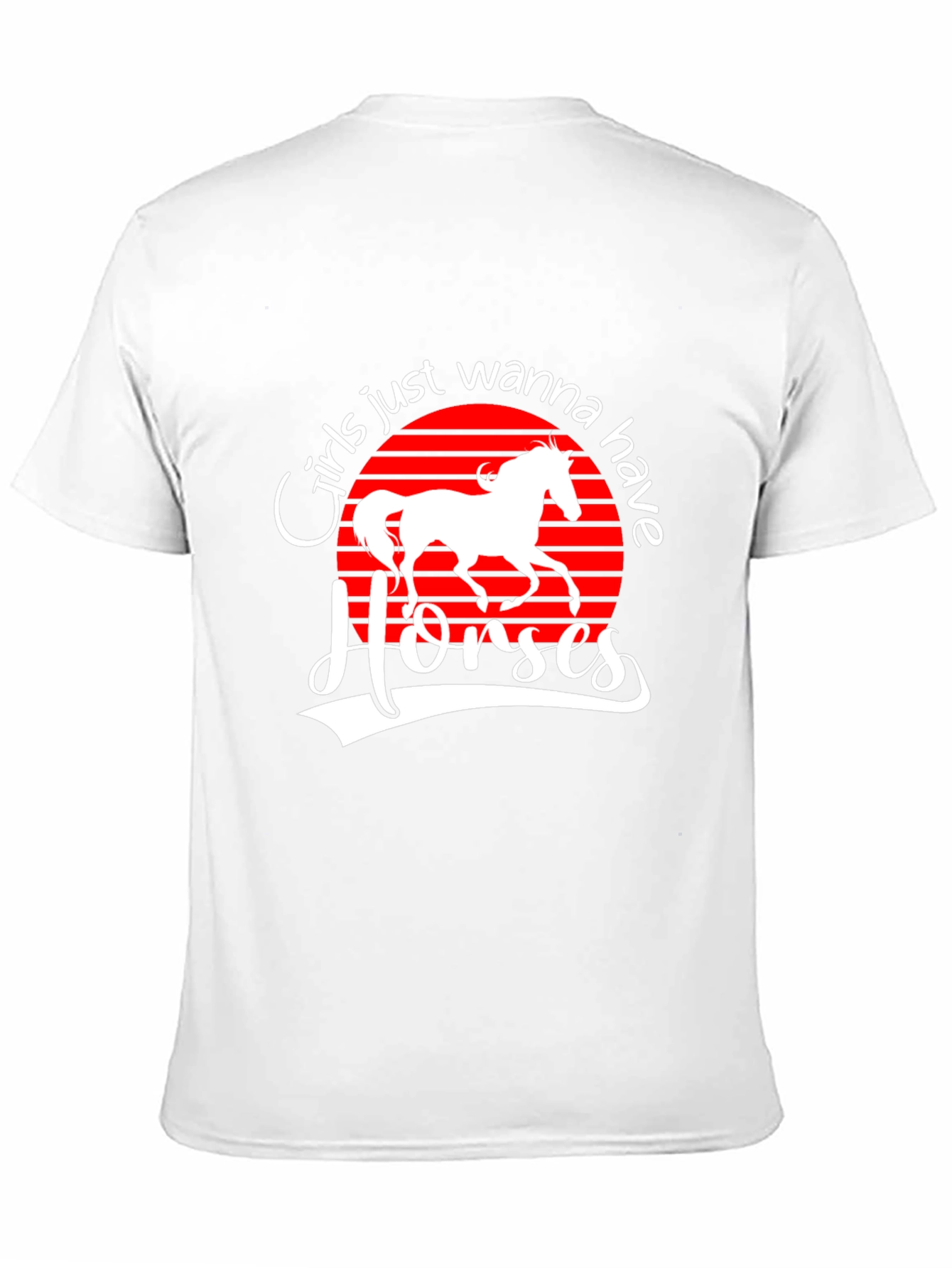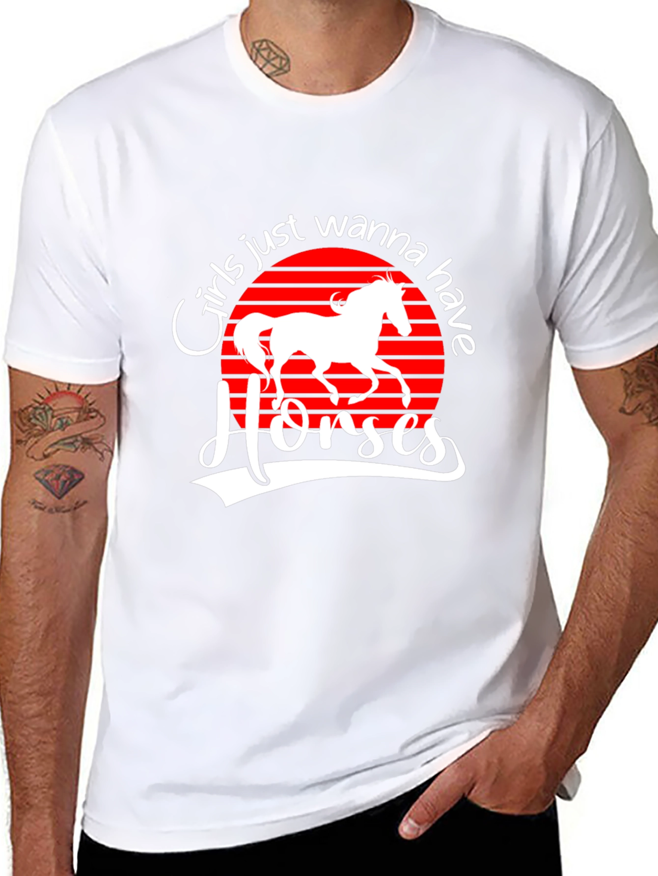Show off your love for horses with this stylish black t-shirt. Featuring a playful graphic with a horse silhouette against a retro sunset design and the phrase "Girls just wanna have Horses", this tee is perfect for equestrians and horse lovers alike. Made from soft, comfortable fabric, this t-shirt offers a relaxed fit for all-day wear. Dress it up with jeans for a casual outing or pair it with shorts for a laid-back summer look. Express your passion for horses with this trendy and eye-catching t-shirt, a must-have addition to any equestrian's wardrobe.