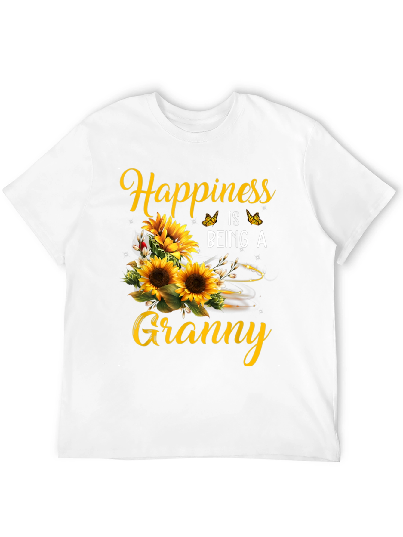 Show your love and pride with this charming black t-shirt, perfect for grandmothers. The shirt features a beautiful design with vibrant sunflowers and delicate butterflies, alongside the heartwarming message "Happiness is Being a Granny" in elegant yellow script. Crafted from comfortable fabric, this tee is ideal for everyday wear, family gatherings, or as a thoughtful gift for that special granny in your life. Celebrate the joy of being a grandmother with this delightful and stylish t-shirt.