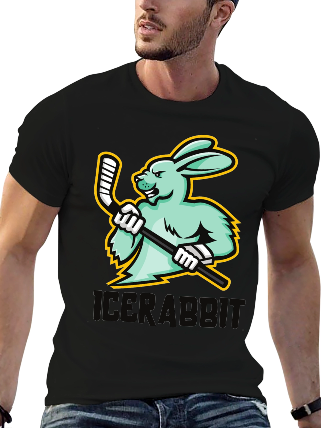 Show off your love for hockey and quirky style with this IceRabbit graphic t-shirt! This black tee features a striking design of a muscular, mint-green rabbit fiercely gripping a hockey stick. The bold, eye-catching graphic is sure to turn heads. Made from a comfortable, breathable fabric, this t-shirt is perfect for everyday wear, hitting the rink, or cheering on your favorite team. It's a unique and playful addition to any wardrobe, making it a great conversation starter. Get yours today and let your passion for the game shine!