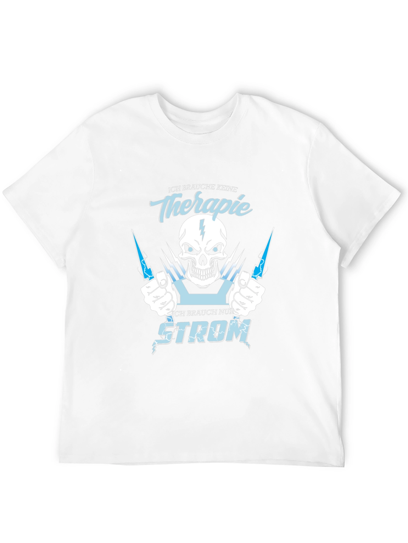 This black t-shirt features a bold and humorous graphic design. At its center is a skull wielding electric zappers in each hand, with the text "Ich Brauche Keine Therapie" above and "Ich Brauche Nur Strom" below. The design is printed in a light blue and white color scheme, giving it a striking contrast against the dark fabric. Made from what appears to be a soft cotton blend, this tee offers both comfort and style. Perfect for casual wear, it's sure to turn heads and spark conversations. Wear it to concerts, casual outings, or simply while lounging at home.