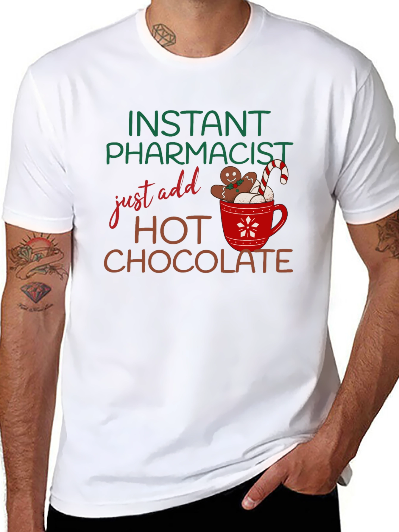 Stay cozy and celebrate the pharmacy life with this unique t-shirt. The design features the words "Instant Pharmacist" in green, above "Just add Hot Chocolate" in red, and "Hot Chocolate" in brown. A charming red mug filled with marshmallows, a candy cane, and a gingerbread man adds a touch of whimsy. Made from a soft, breathable fabric, this black t-shirt is comfortable for everyday wear. It's perfect for pharmacists, pharmacy technicians, or anyone who appreciates a warm cup of hot chocolate during the holiday season. Wear it to work, holiday parties, or casual outings to show off your pharmacy pride and festive spirit.