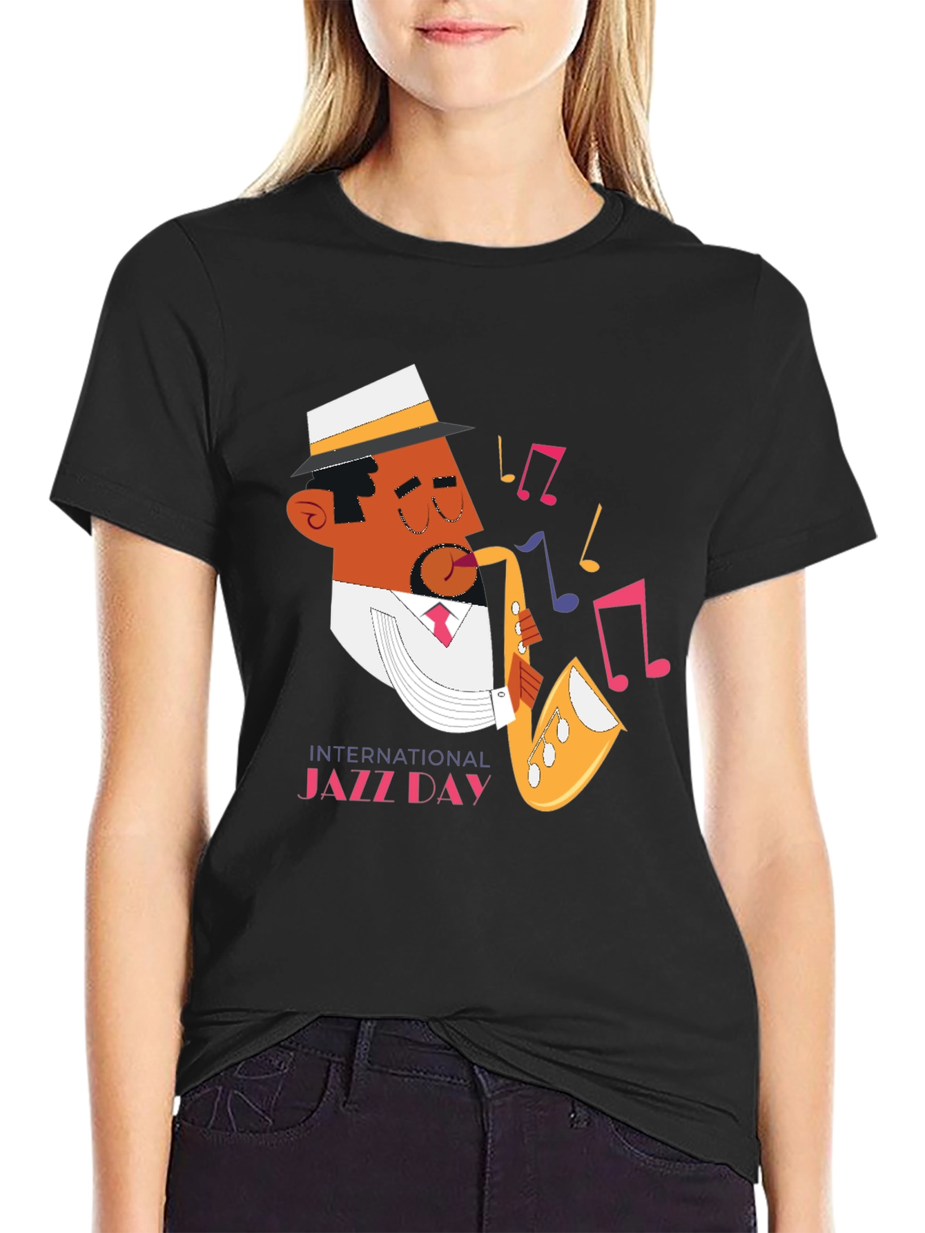 Celebrate International Jazz Day in style with this eye-catching black t-shirt! The shirt features a vibrant, stylized graphic of a jazz musician playing the saxophone, complete with musical notes. The design is printed on a comfortable, likely cotton or cotton-blend fabric. This t-shirt is perfect for music lovers, jazz enthusiasts, or anyone who appreciates unique and expressive apparel. Wear it to concerts, festivals, casual outings, or simply to showcase your passion for jazz. Make a statement and spread the joy of jazz with this cool and stylish tee!