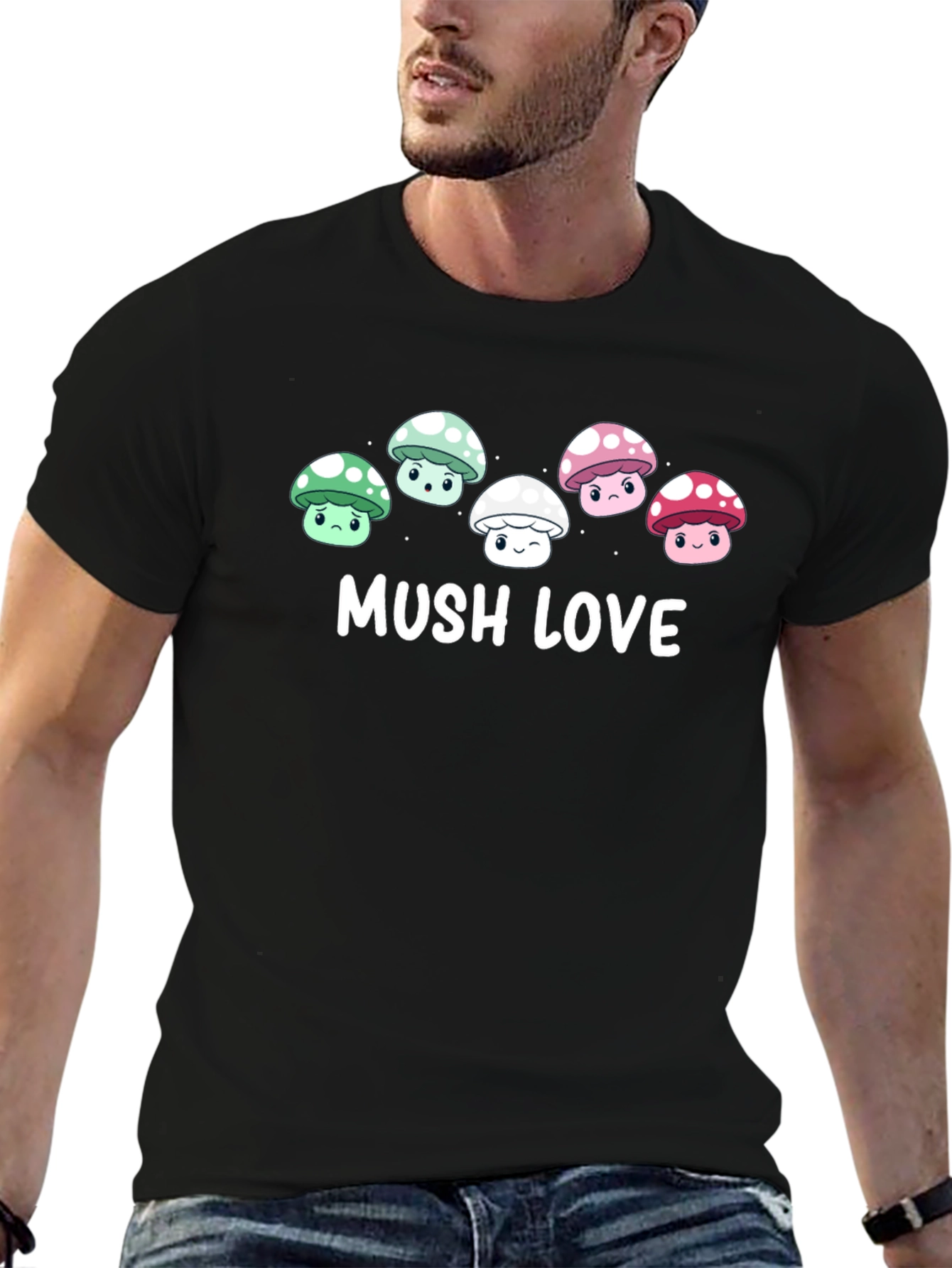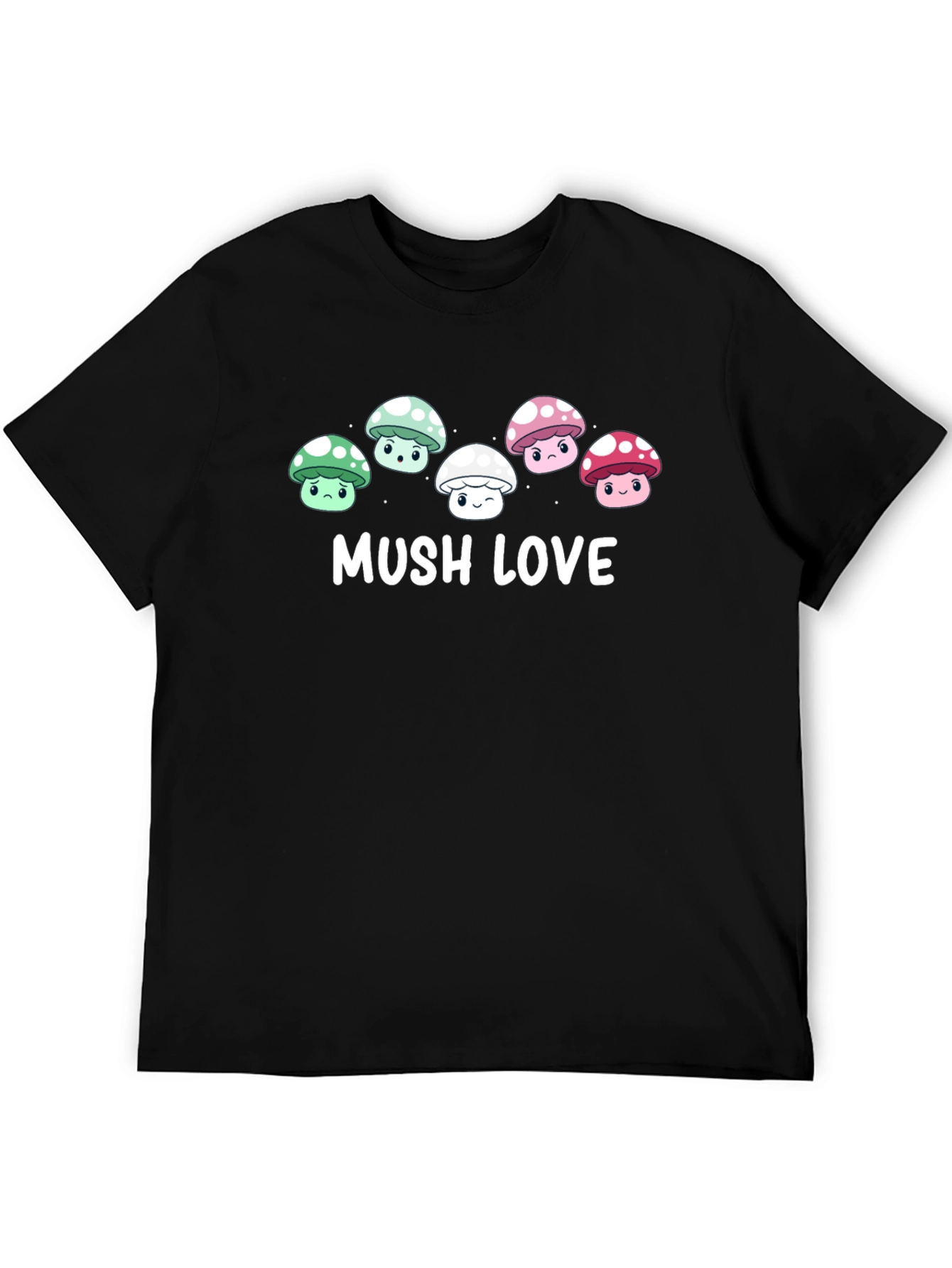 Express your love for all things whimsical with this adorable 'Mushroom Love' graphic tee. Made from a soft, comfortable material (appearance suggests cotton blend), this classic black t-shirt features a charming row of cartoon mushrooms, each with unique colors (green, white, pink) and expressions. The playful design and bold 'MUSH LOVE' text make it a fun and eye-catching addition to any casual wardrobe. Perfect for nature lovers, mushroom enthusiasts, or anyone who appreciates a touch of cuteness. Wear it to concerts, casual hangouts, or while exploring the great outdoors. Guaranteed to bring a smile to your face and spark conversations!