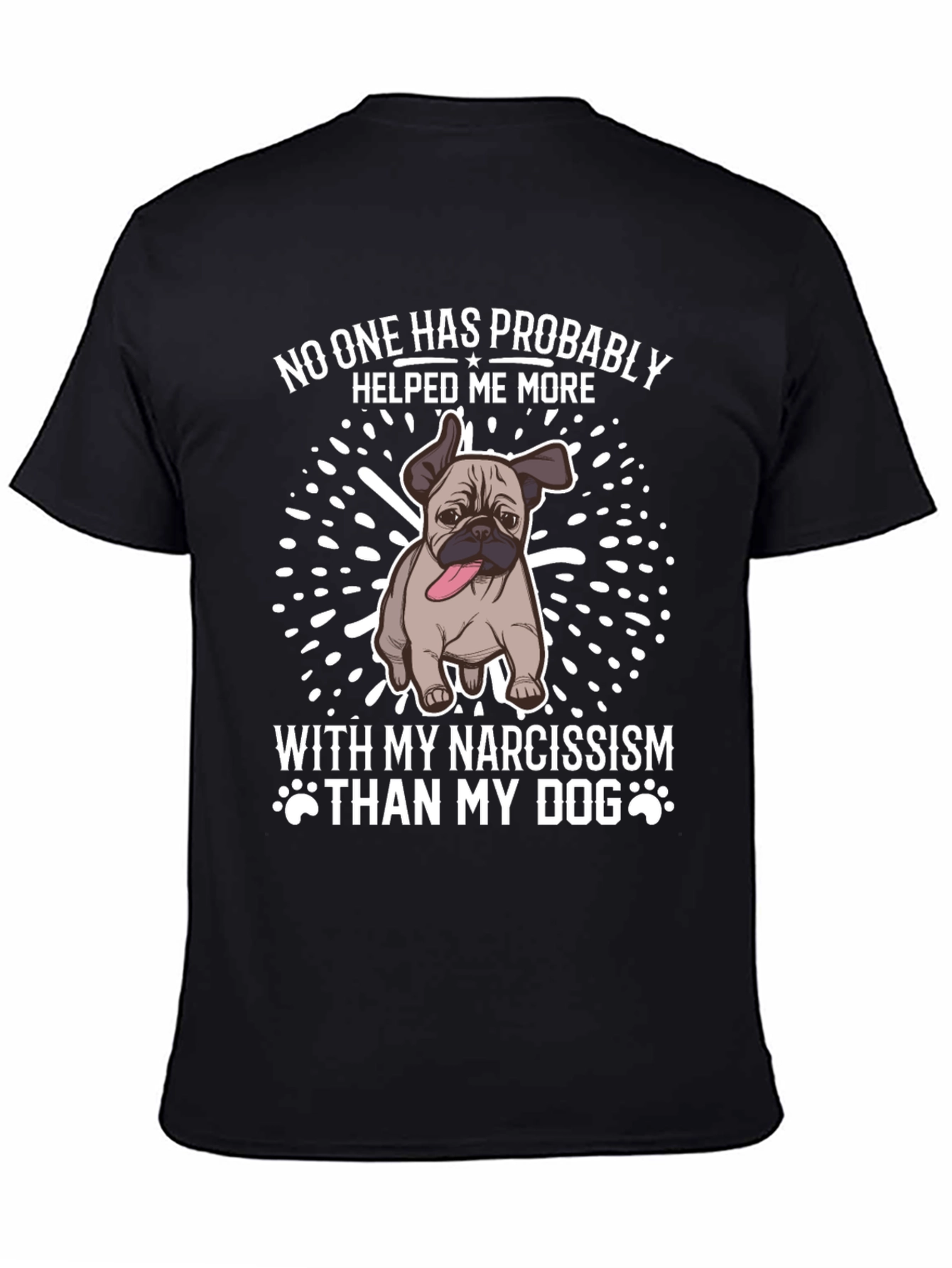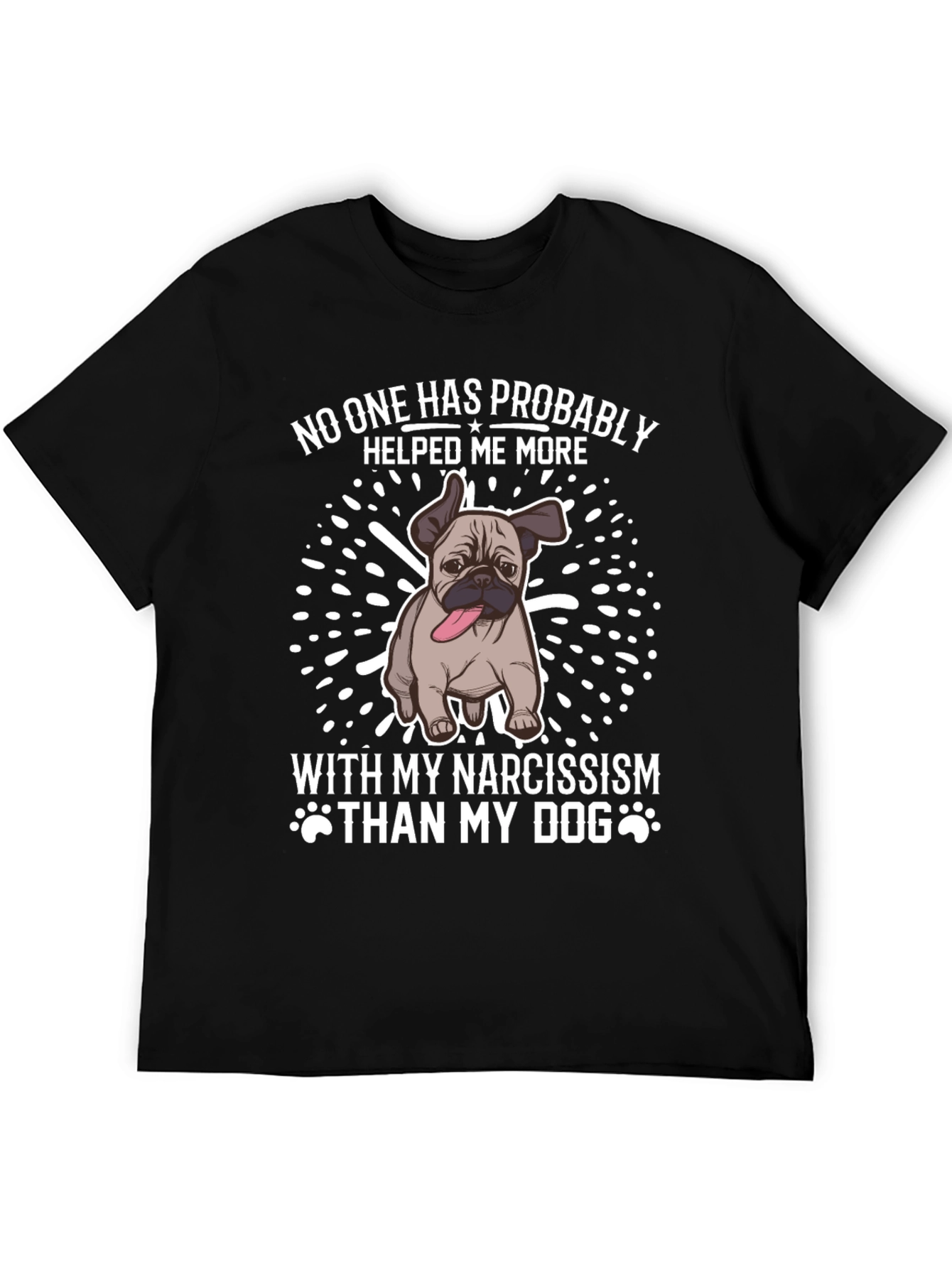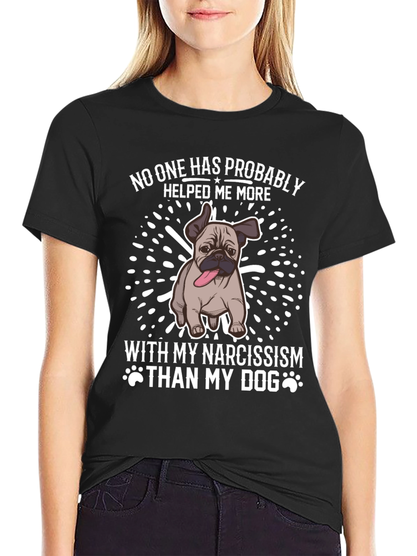 This black graphic tee features a humorous design perfect for dog lovers with a sense of humor. The shirt reads "No one has probably helped me more with my narcissism than my dog," accompanied by an adorable cartoon dog graphic. It's made of a comfortable-looking fabric, likely a soft cotton blend, making it ideal for casual wear. Whether you're running errands, lounging at home, or meeting up with friends, this tee adds a touch of personality to any outfit. A great conversation starter and a fun way to show off your love for your four-legged friend!