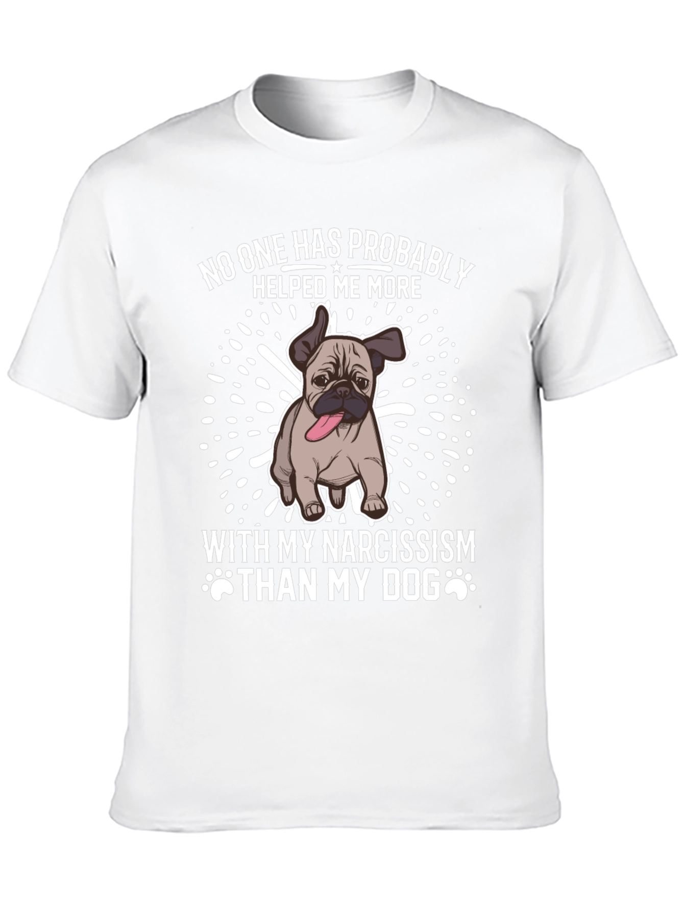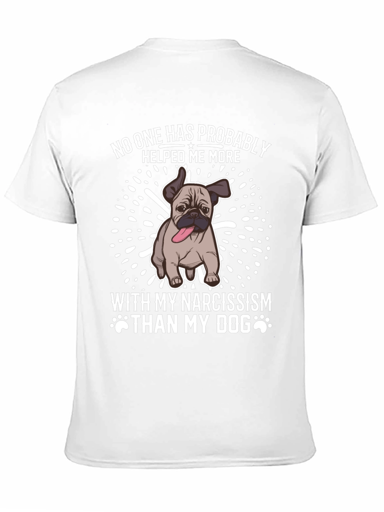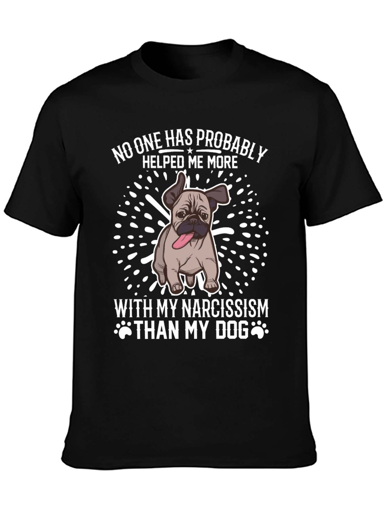 This black graphic tee features a humorous design perfect for dog lovers with a sense of humor. The shirt reads "No one has probably helped me more with my narcissism than my dog," accompanied by an adorable cartoon dog graphic. It's made of a comfortable-looking fabric, likely a soft cotton blend, making it ideal for casual wear. Whether you're running errands, lounging at home, or meeting up with friends, this tee adds a touch of personality to any outfit. A great conversation starter and a fun way to show off your love for your four-legged friend!