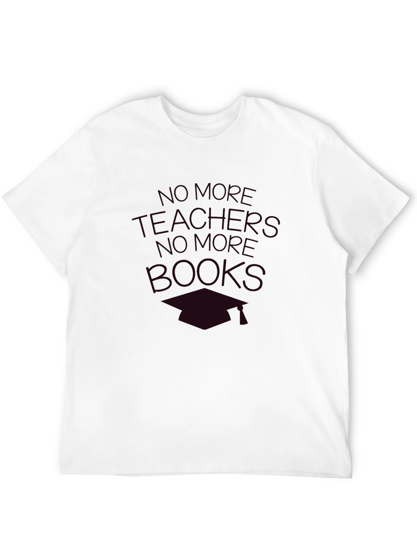 This classic black t-shirt features the humorous saying 'No More Teachers No More Books' with a graduation cap graphic. Made from what appears to be a soft, comfortable cotton blend, this tee is perfect for celebrating graduation or the end of the school year. The design is printed in a subtle maroon color. This t-shirt offers a relaxed fit, making it ideal for casual wear. Show off your graduate spirit with this fun and witty shirt! It's a great gift for students, teachers, or anyone celebrating academic milestones.