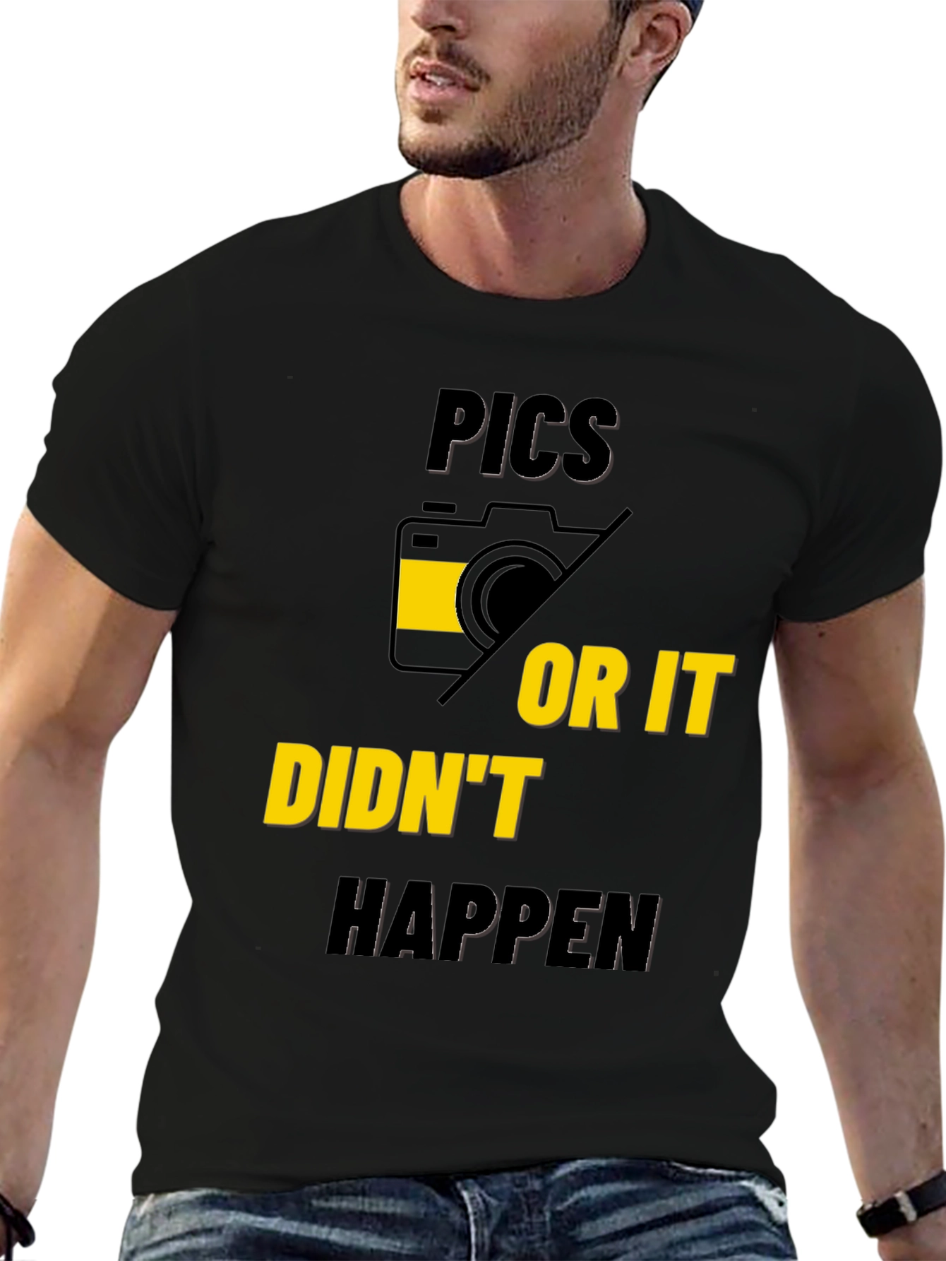 This black graphic tee features a bold and humorous design that is sure to turn heads. The phrase "Pics OR It DIDN'T HAPPEN" is prominently displayed, accompanied by a stylized camera graphic. The design incorporates both yellow and black colors. Made from a comfortable-looking fabric, this t-shirt is perfect for casual wear. The message of the shirt is perfect for social gatherings, vacations, and everyday activities where you want to make a statement about the importance of capturing memories. Its eye-catching design ensures you'll stand out while expressing your witty side. The shirt is a great conversation starter and will definitely add some fun to your wardrobe.