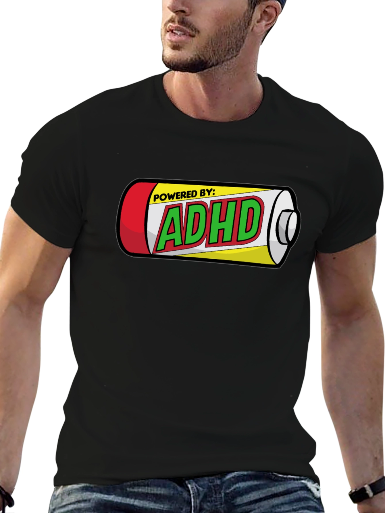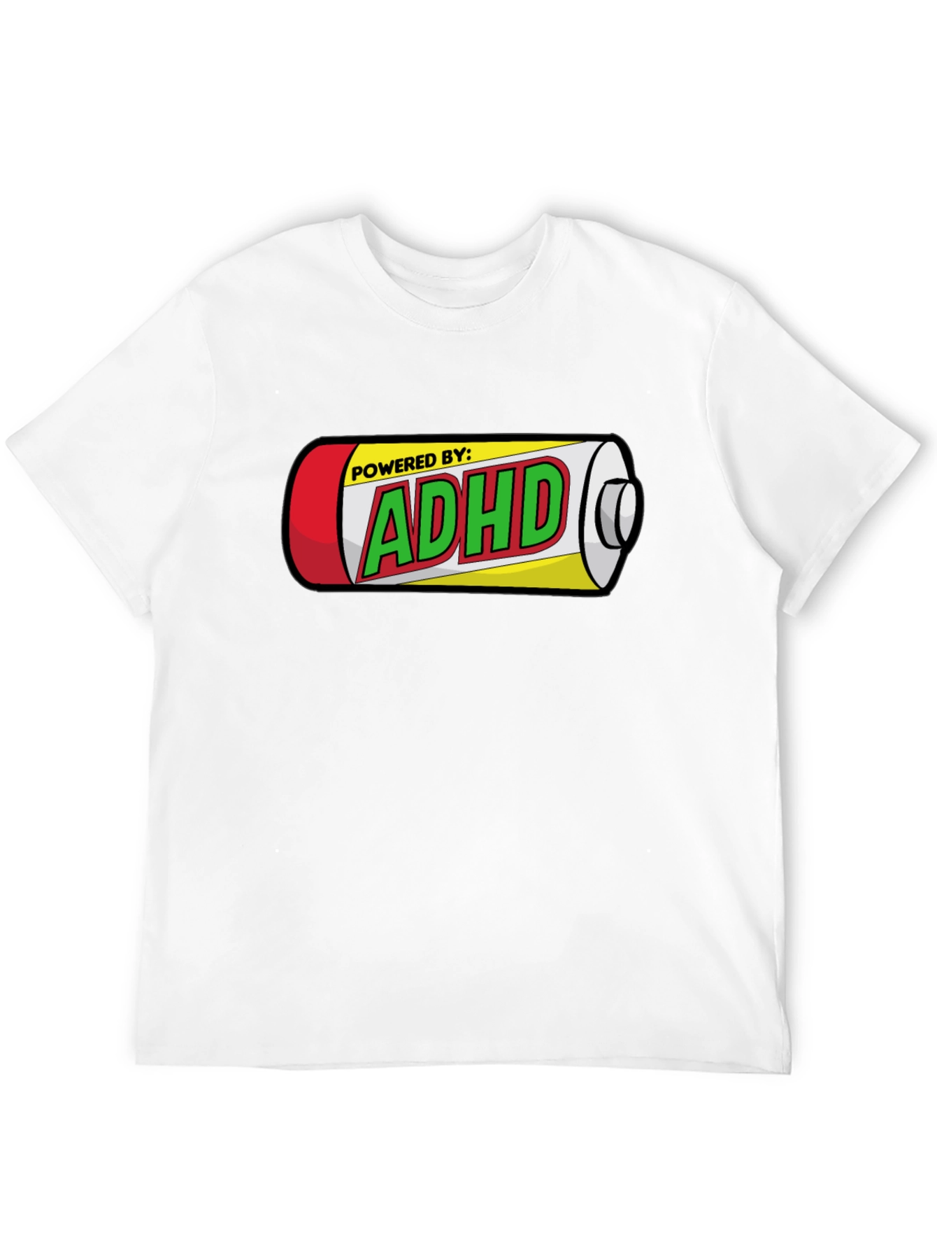 Show off your unique personality with this eye-catching 'Powered By: ADHD' t-shirt. The design features a playful, cartoon-style battery graphic with vibrant colors and bold lettering. Made from a comfortable, breathable fabric, this t-shirt is perfect for everyday wear. Whether you're running errands, hanging out with friends, or simply lounging at home, this shirt is sure to make a statement. It's a fun way to express yourself and embrace your individuality. Also makes a great gift for someone with ADHD. Get yours today and let your energy shine!