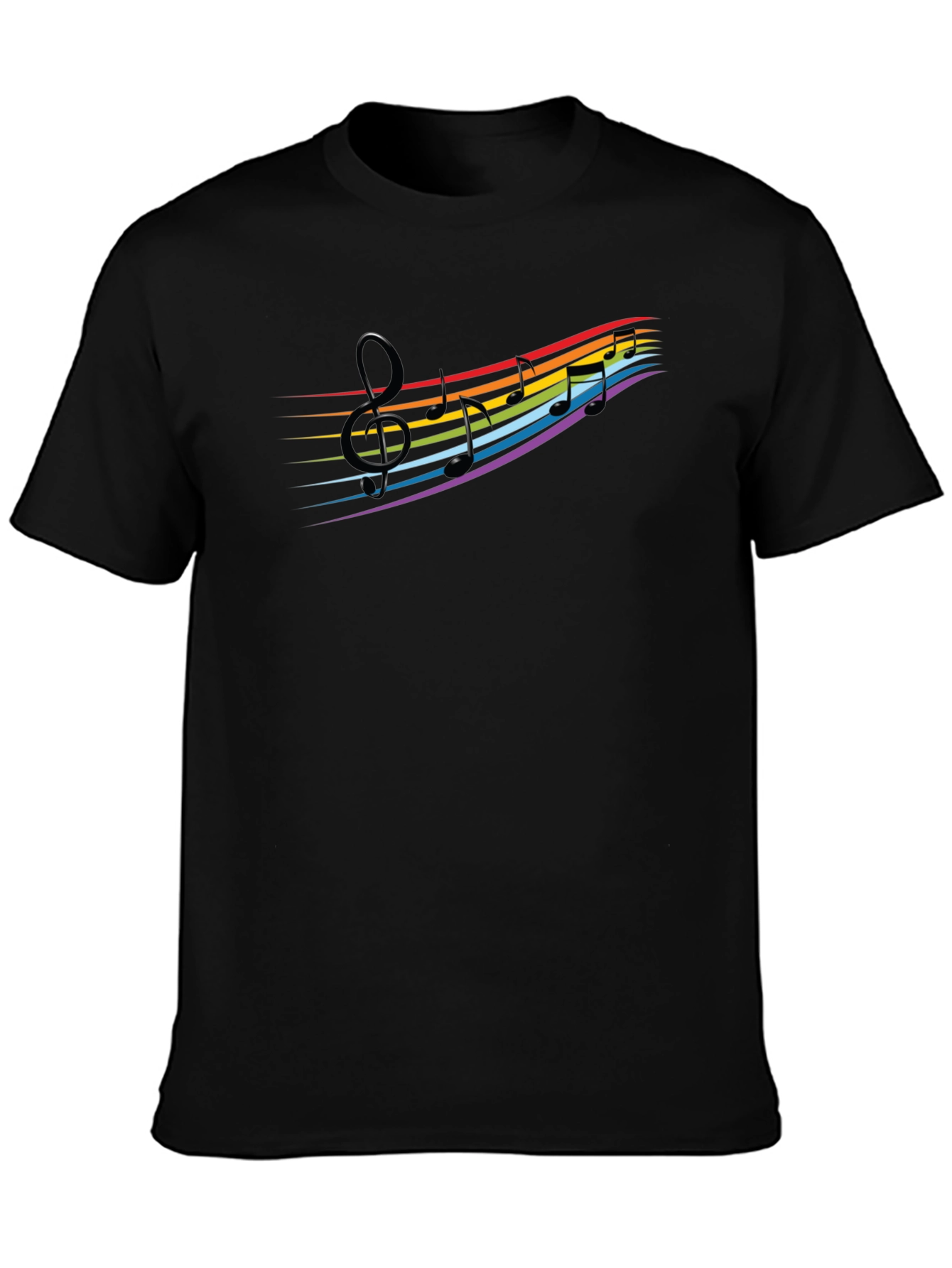 Express your love for music and vibrant style with this eye-catching black t-shirt! The shirt features a bold graphic of music notes flowing along rainbow-colored lines, creating a striking visual effect. Made from a soft, comfortable fabric, this tee is perfect for everyday wear. Its classic fit makes it a versatile addition to any wardrobe. Whether you're a musician, a music enthusiast, or simply love unique and colorful designs, this t-shirt is a must-have. Wear it to concerts, music festivals, casual outings, or even while relaxing at home. It's a great way to showcase your personality and interests.