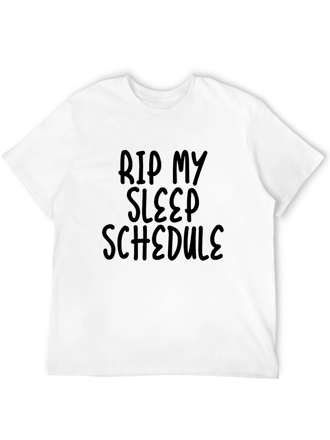 Embrace the chaos of sleepless nights with this bold, black graphic tee! The shirt features the playful phrase "RIP My Sleep Schedule" in a casual, slightly distressed font, perfect for anyone who knows the struggle of an erratic sleep pattern. Crafted from a soft-looking fabric, this tee offers both comfort and style. Its classic fit makes it a versatile addition to any casual wardrobe. Wear it while you're catching up on late-night studies, enjoying a movie marathon, or simply making a statement about your unconventional lifestyle. This tee is sure to be a conversation starter and a relatable piece for fellow night owls!