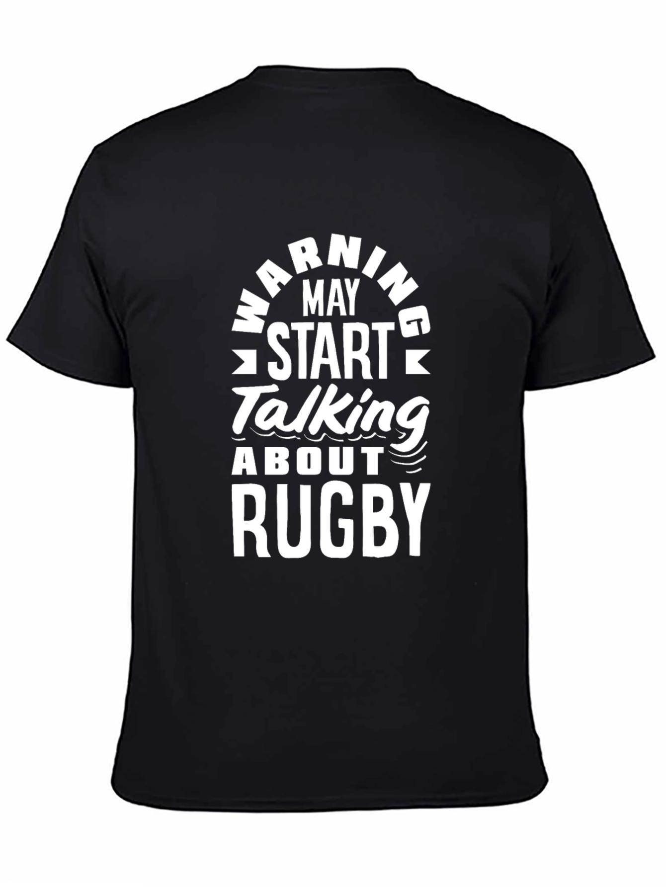 Show off your love for rugby with this eye-catching black t-shirt. The shirt features a bold, white graphic design with the humorous warning: "Warning May Start Talking About Rugby." Made from a comfortable-looking fabric, this tee is perfect for casual wear, game days, or showing support for your favorite team. The short sleeves and classic fit make it a versatile addition to any wardrobe. Get ready to spark conversations and share your rugby passion with this unique and stylish t-shirt.