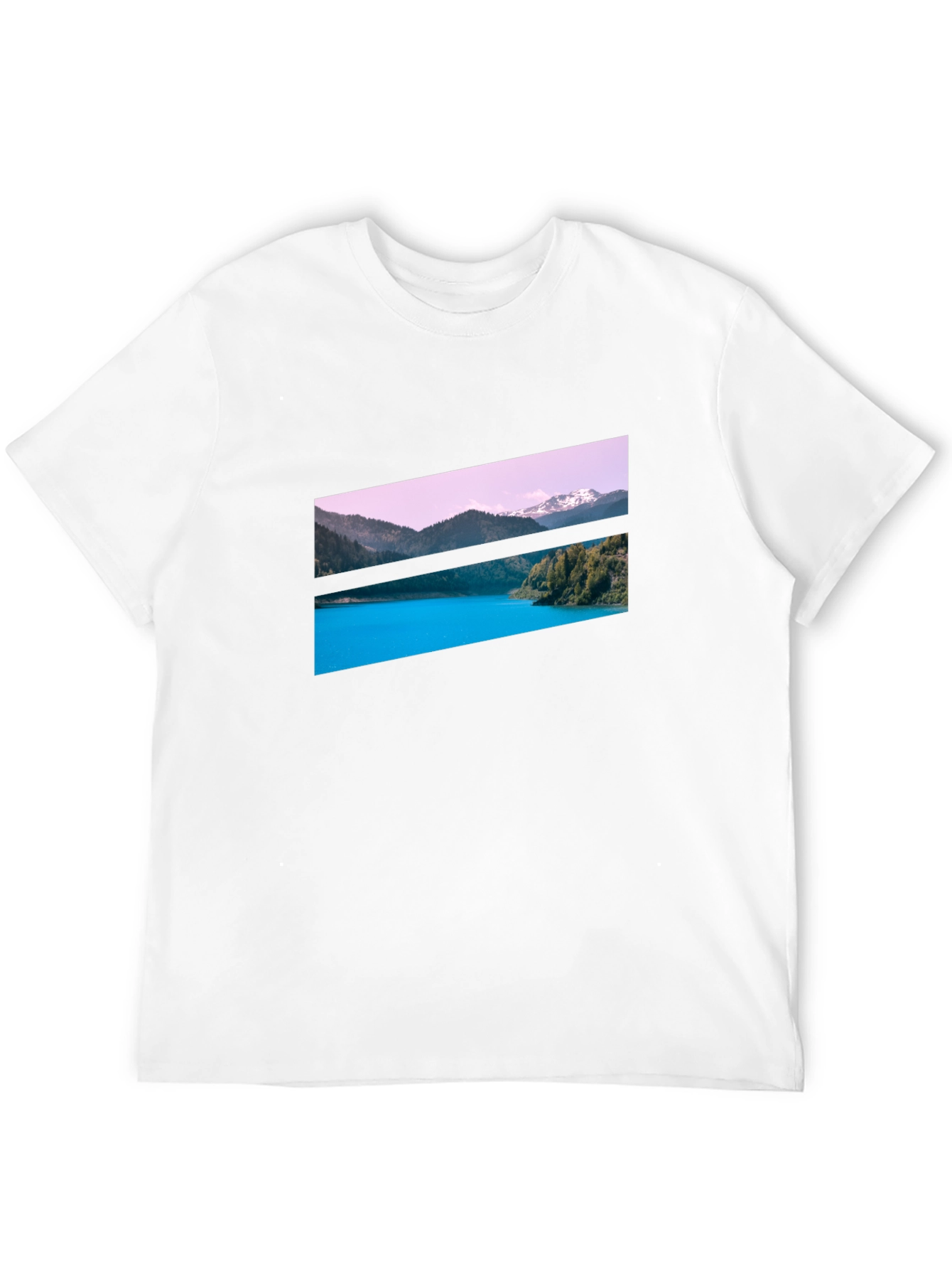 Elevate your casual style with this striking black graphic tee. The design features a captivating mountain lake scene, creating a unique and eye-catching visual. The vibrant blue water contrasts beautifully with the mountainous backdrop. Made from comfortable materials, this t-shirt offers a relaxed fit, perfect for everyday wear. Pair it with jeans or shorts for a laid-back yet stylish look. Whether you're exploring the outdoors or simply hanging out with friends, this tee is sure to make a statement. Comfortable and stylish, this tee is a wardrobe must-have.