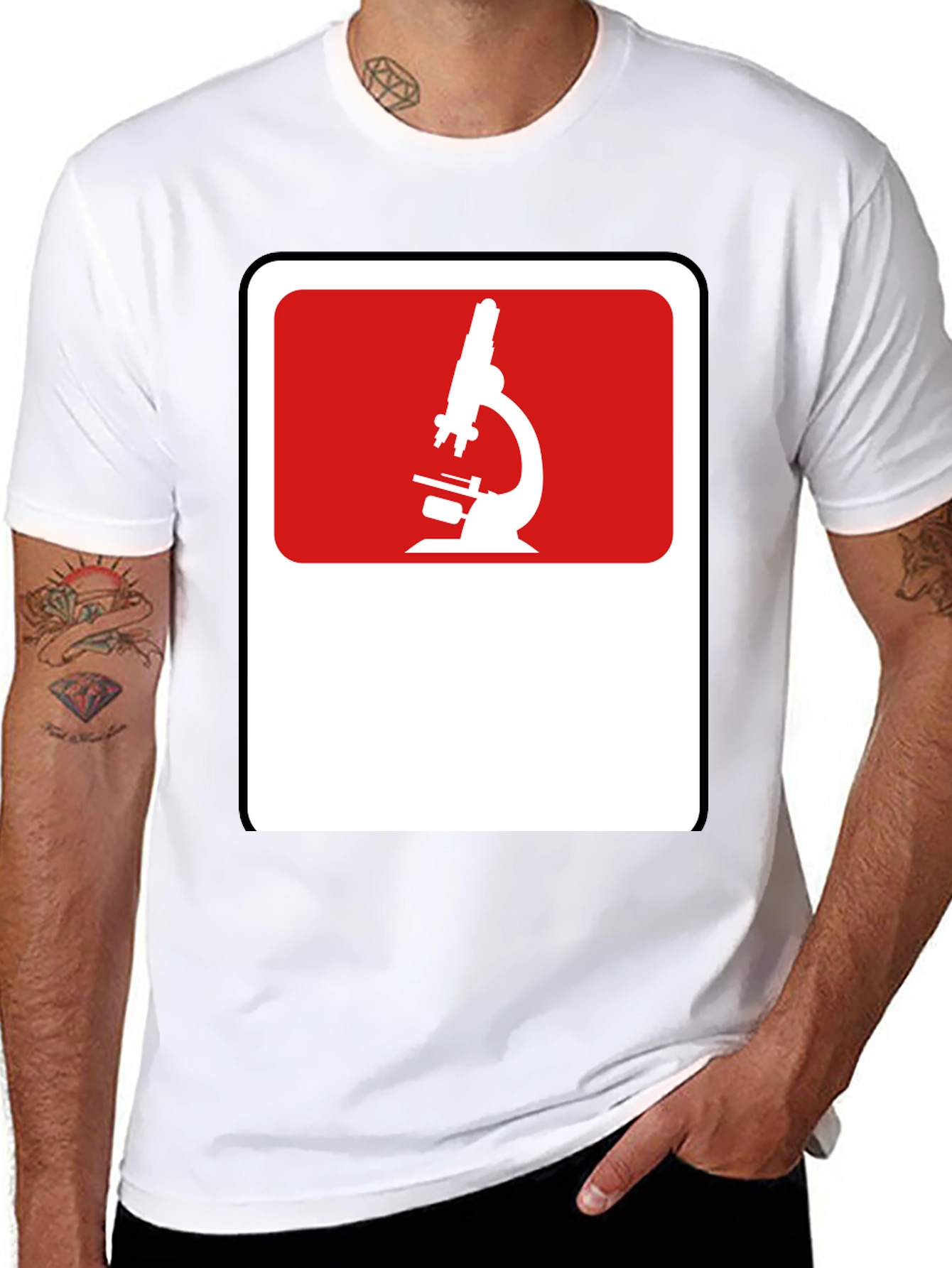 Show off your love for science with this stylish black t-shirt. The shirt features a bold, eye-catching graphic of a microscope in white against a red and white block design. The unique and striking design makes it a great conversation starter. Made from a comfortable, breathable fabric, this tee is perfect for everyday wear. Whether you're a student, teacher, or simply a science enthusiast, this shirt is a perfect way to express your passion. Pair it with jeans or shorts for a casual, cool look. Add this unique piece to your wardrobe today!