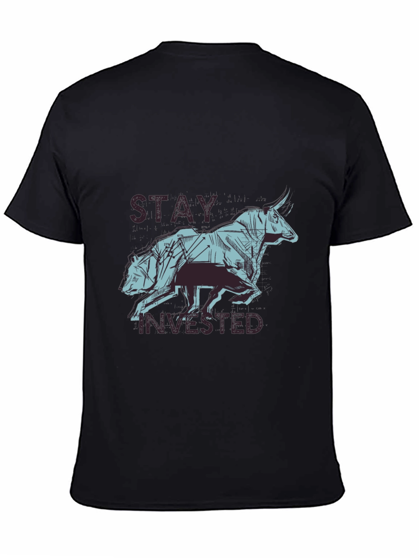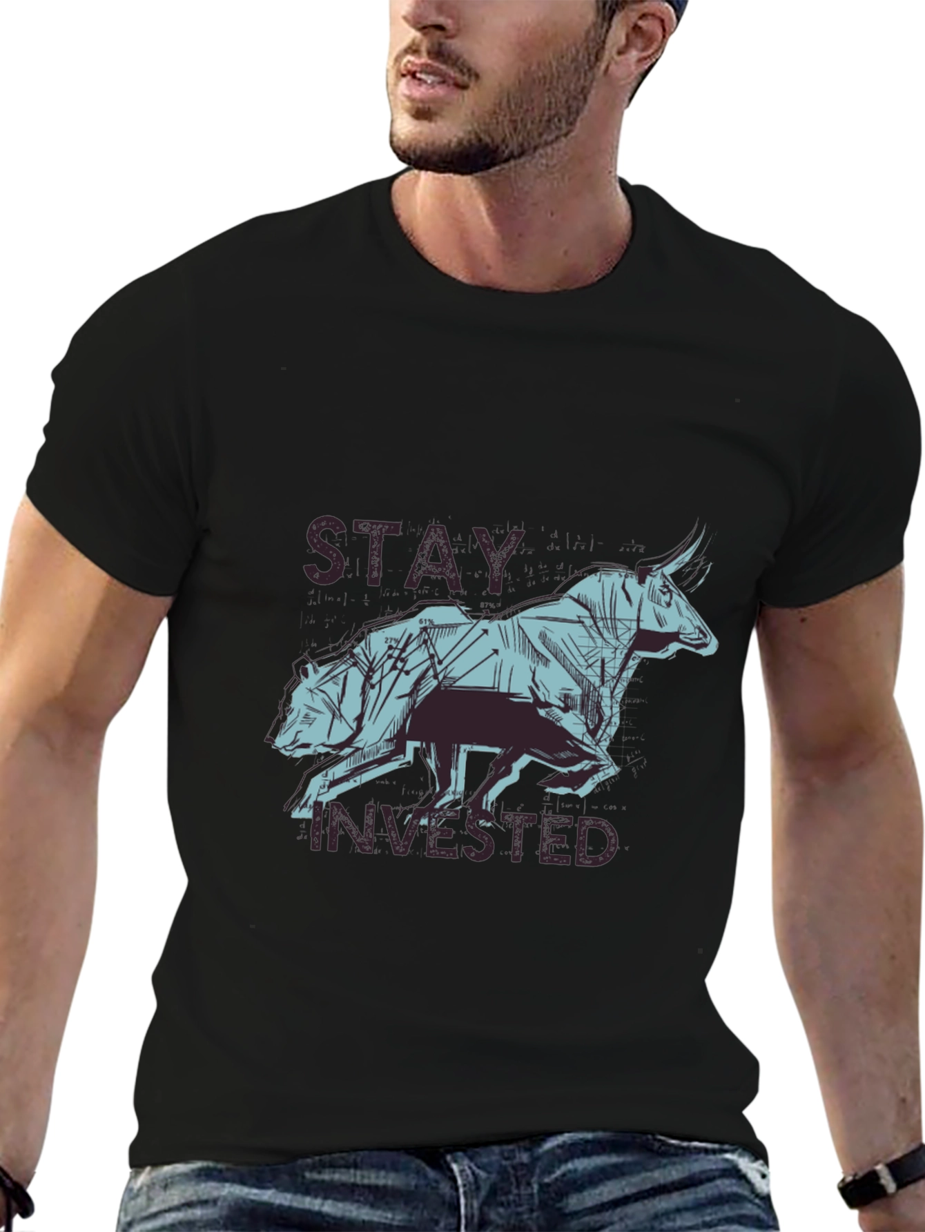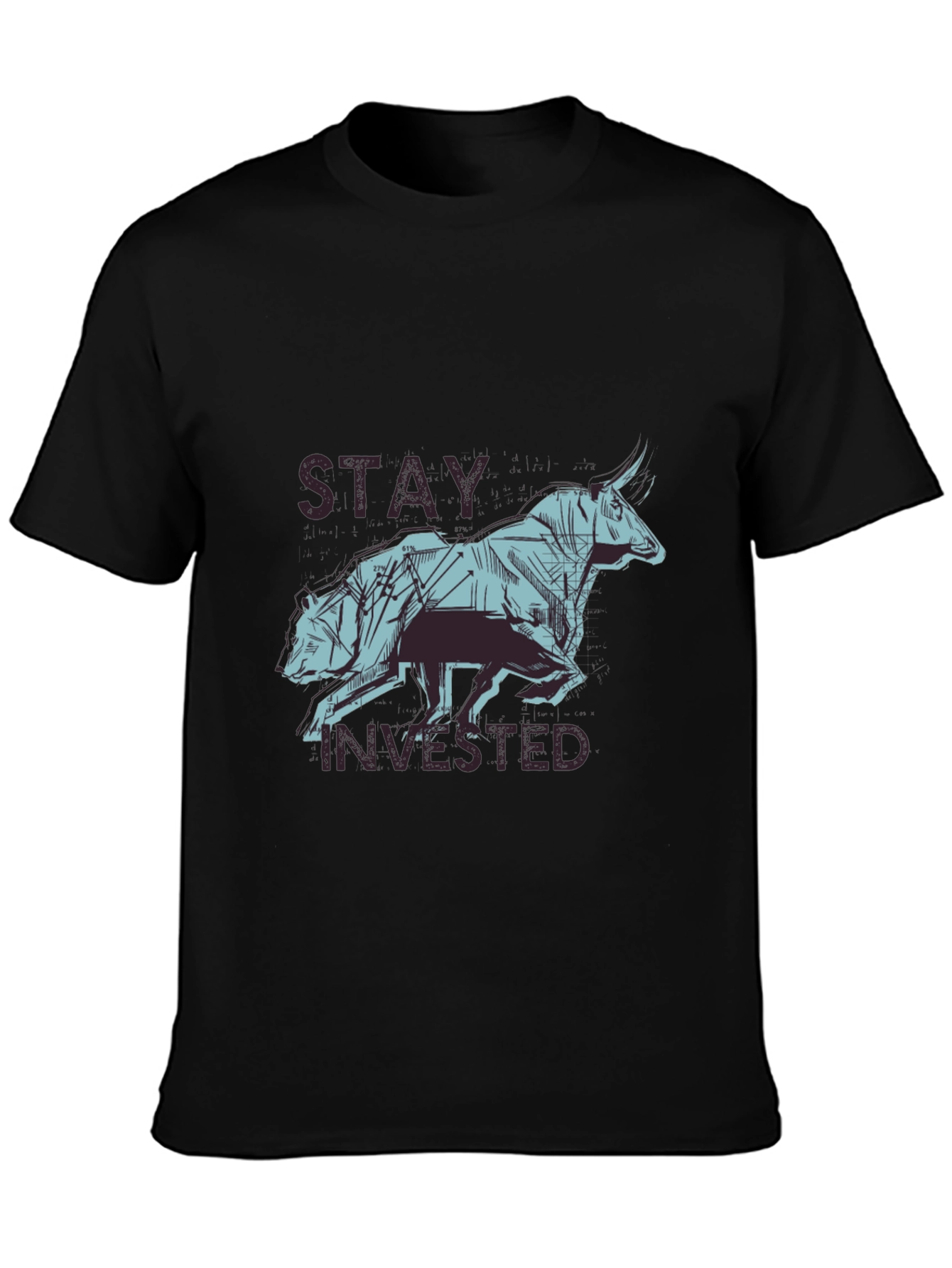 Show your love for finance with this sleek, black t-shirt! Featuring a unique graphic design of a bull and bear symbolizing the market, emblazoned with the words "Stay Invested." This short-sleeved tee is perfect for casual wear, investing meetups, or just making a statement. The design offers a modern, artistic touch. Made with comfortable materials for everyday wear, it's an ideal gift for traders, stock enthusiasts, or anyone passionate about the world of finance. Stay stylish and engaged with this distinctive t-shirt.