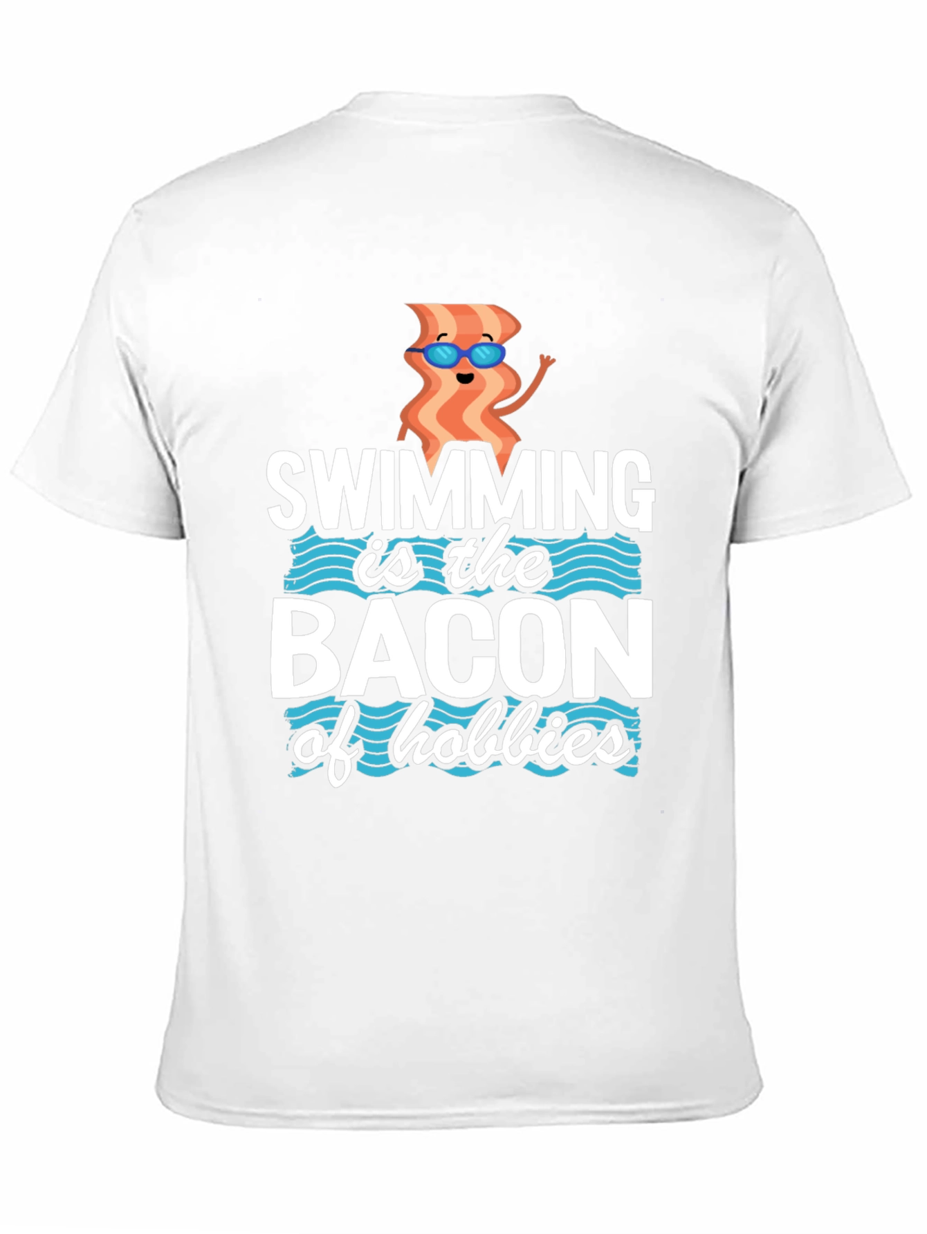 Dive into fun with this black graphic tee featuring a playful design! The shirt showcases the text "SWIMMING is the BACON of hobbies," accompanied by a whimsical bacon strip character wearing sunglasses. Crafted from comfortable fabric, this t-shirt offers a relaxed fit, perfect for casual wear. Express your love for swimming and a humorous twist on hobbies with this unique and eye-catching tee. Ideal for everyday wear, workouts, or as a quirky gift for the bacon and swim enthusiast in your life!