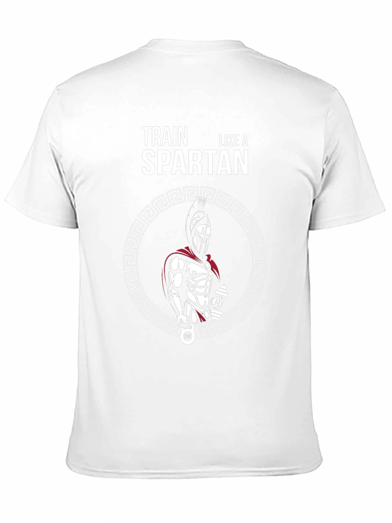Unleash your inner warrior with this bold black t-shirt featuring a striking graphic of a Spartan warrior lifting weights. Encircling the warrior is a white Greek key pattern, adding an element of classic style. Above, the phrase 'Train Like a Spartan' is printed in bold white letters, serving as the perfect motivation for your workouts or everyday wear. This tee is ideal for fitness enthusiasts, history buffs, or anyone who appreciates a powerful and inspiring design. Made from comfortable fabric, it's perfect for hitting the gym or casual outings.