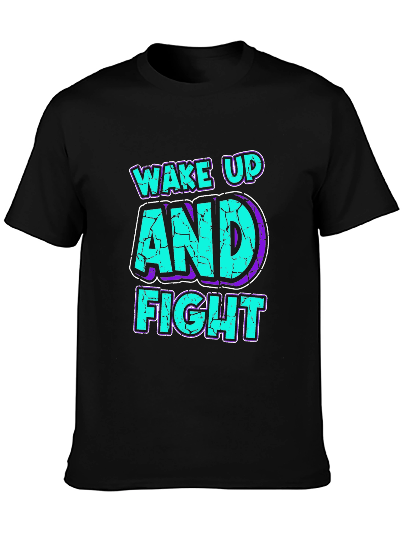 Unleash your inner fighter with this bold "Wake Up and Fight" graphic tee. Made from a comfortable, breathable fabric, this black t-shirt features an eye-catching design in vibrant turquoise and purple. The distressed, cracked effect gives it a cool, edgy look. Perfect for workouts, casual wear, or making a statement. Show the world you're ready to take on any challenge. Get yours today and inspire those around you!